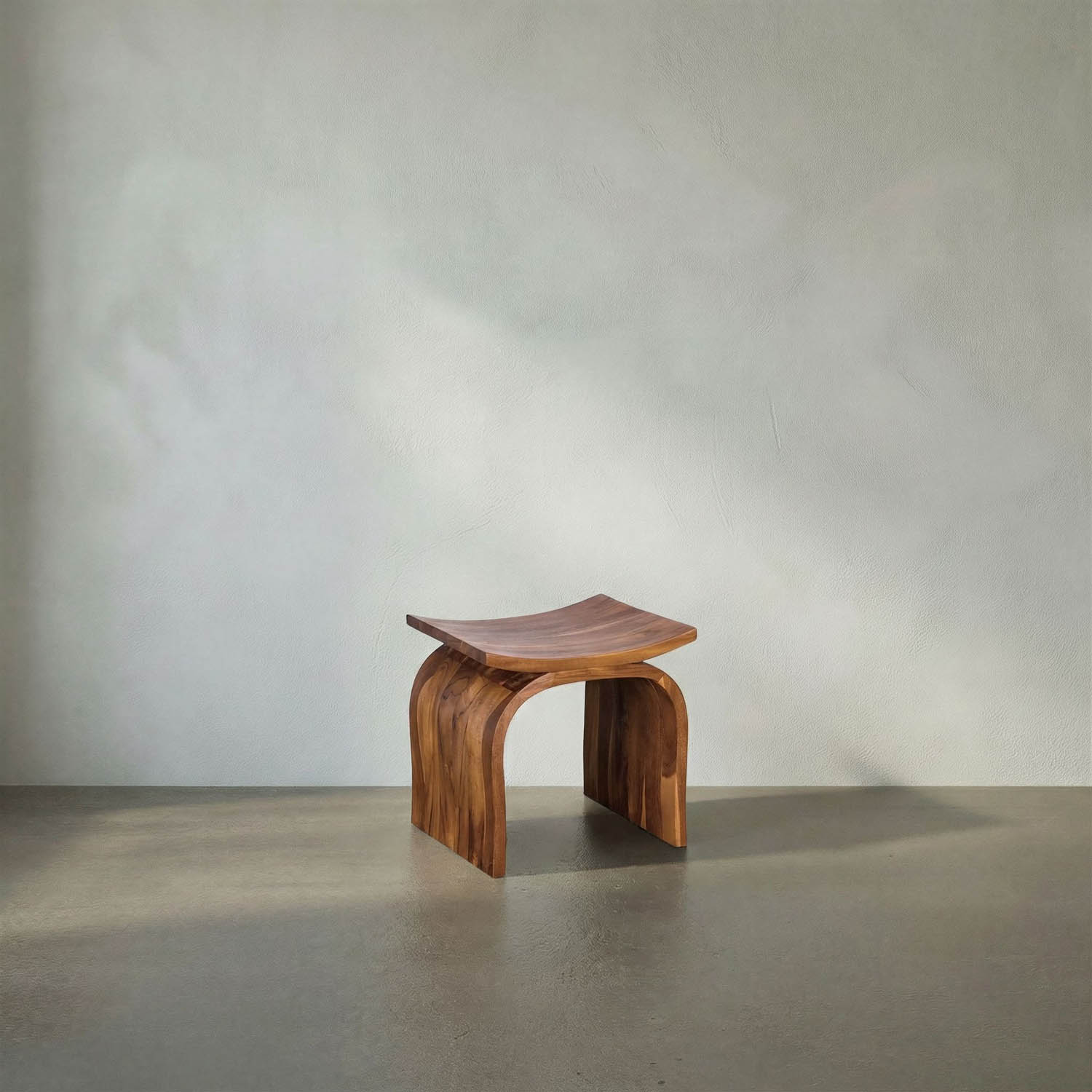A sculptural, solid wood stool featuring curved, inverted-U-shaped legs and a saddle seat. The precise shaping highlights the natural grain, resulting in a balanced, organic-modern form with a strong visual lightness.