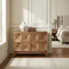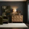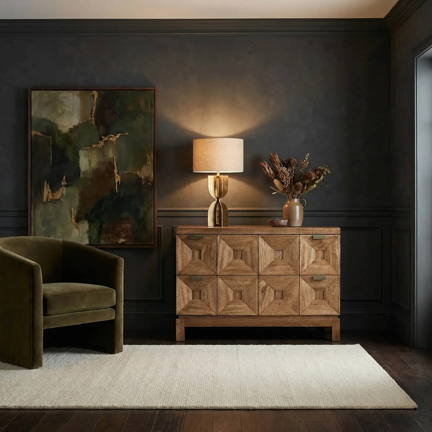 This two-drawer cabinet in Dark Walnut features six faceted, pyramidal drawer fronts that add sculptural depth and showcase dynamic wood grain. Minimal brass pulls and a defined base provide a grounded yet refined appearance, blending artisanal details with a clean, architectural style.