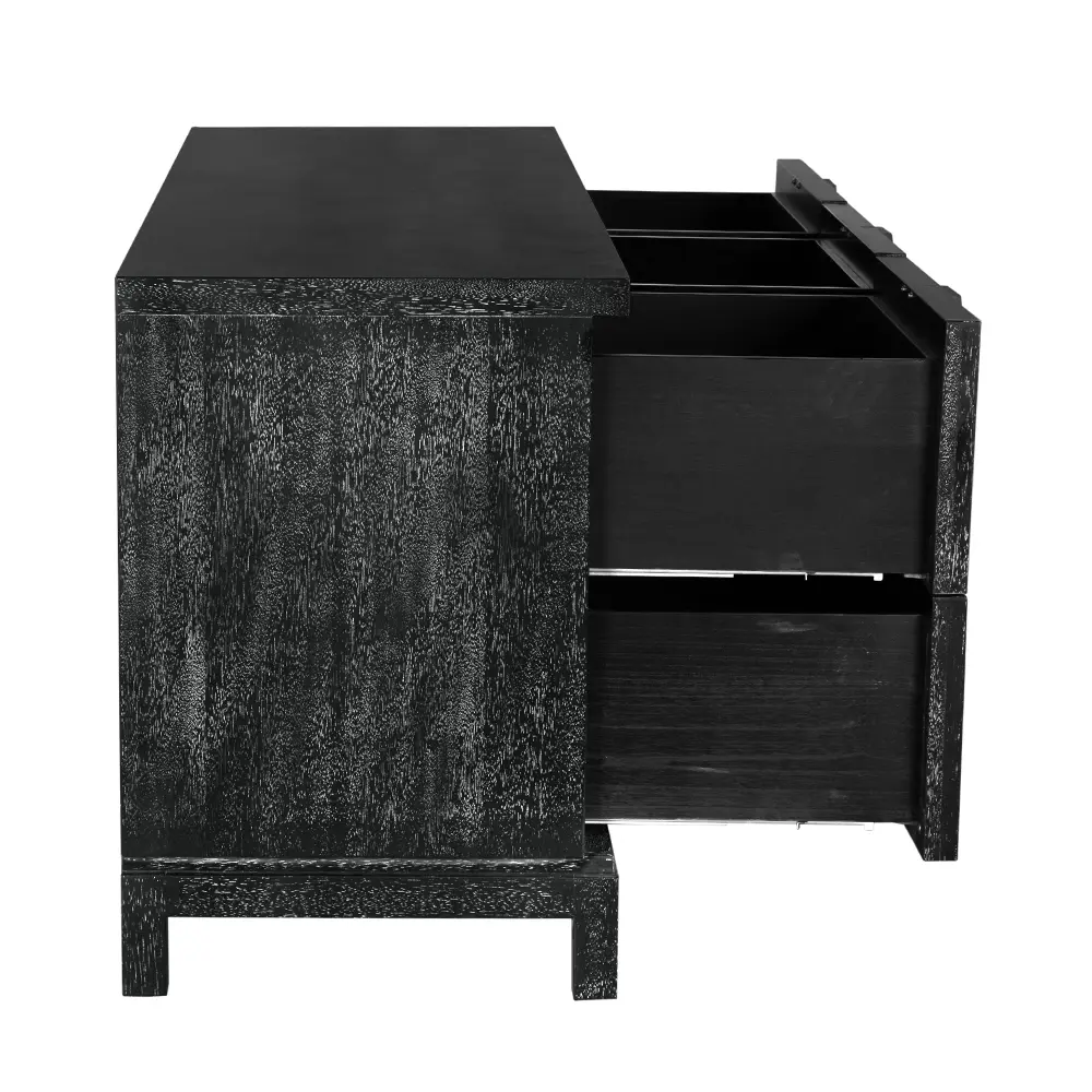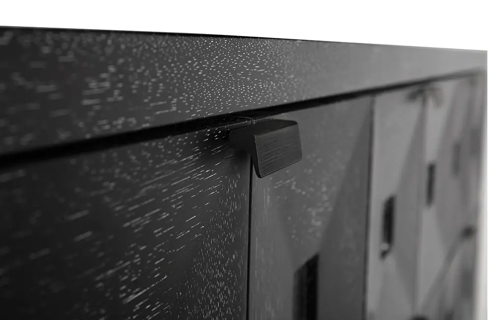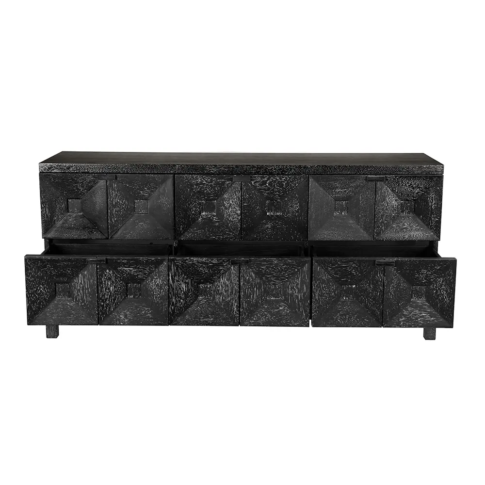 A sculptural sideboard with a monolithic silhouette, featuring a grid of six faceted drawer fronts. Finished in our Black walnut finish, it balances brutalist geometry, artisanal surface treatment, and contemporary architectural presence.