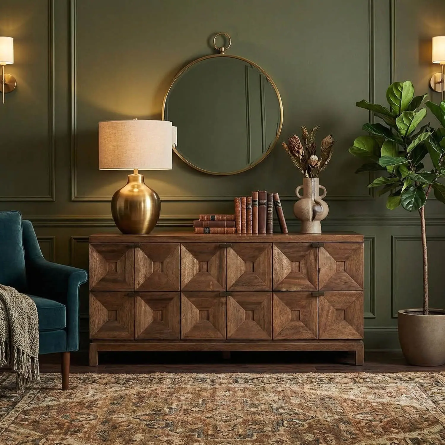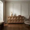This six-drawer cabinet in Dark Walnut features six faceted, pyramidal drawer fronts that add sculptural depth and showcase dynamic wood grain. Minimal brass pulls and a defined base provide a grounded yet refined appearance, blending artisanal details with a clean, architectural style.