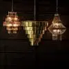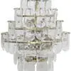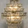 This six-tiered chandelier features layered textured glass ovals on a brass frame. Inspired by Mid-Century Murano design, it offers soft, ambient light and elegant vintage character for statement-making interiors.