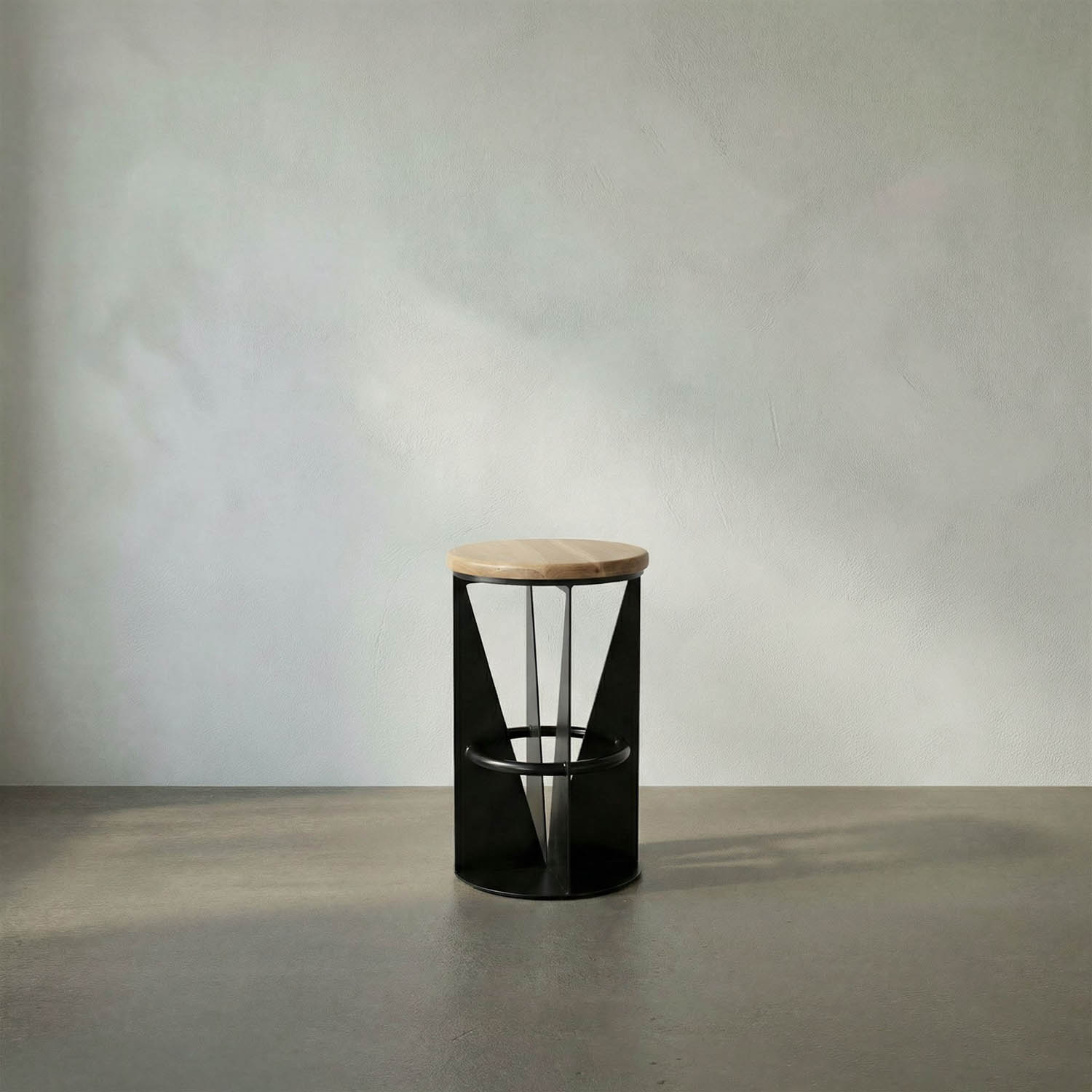 This swivel bar stool showcases a geometric, architectural silhouette with a round white oak seat. A circular footrest adds functional contrast, emphasizing industrial minimalism through sculptural tension and balance.
