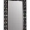 The Nanna Mirror features a shield-like mahogany frame featuring stepped circular medallions. Its Hand-Rubbed Black finish, complemented by light brown trim, emphasizes the carved details, making a bold and sculptural statement.