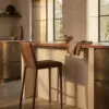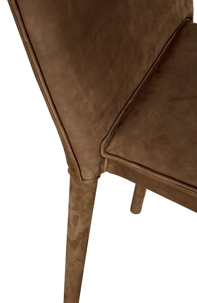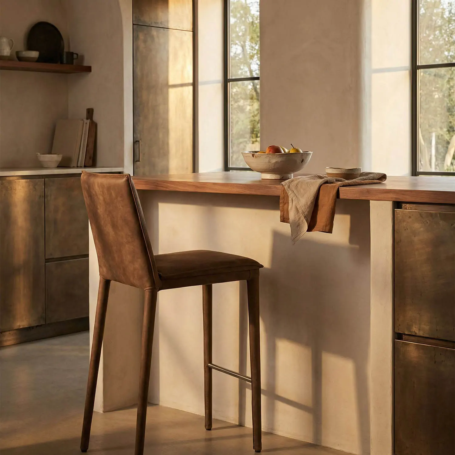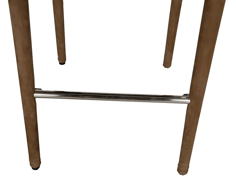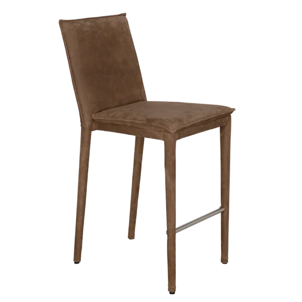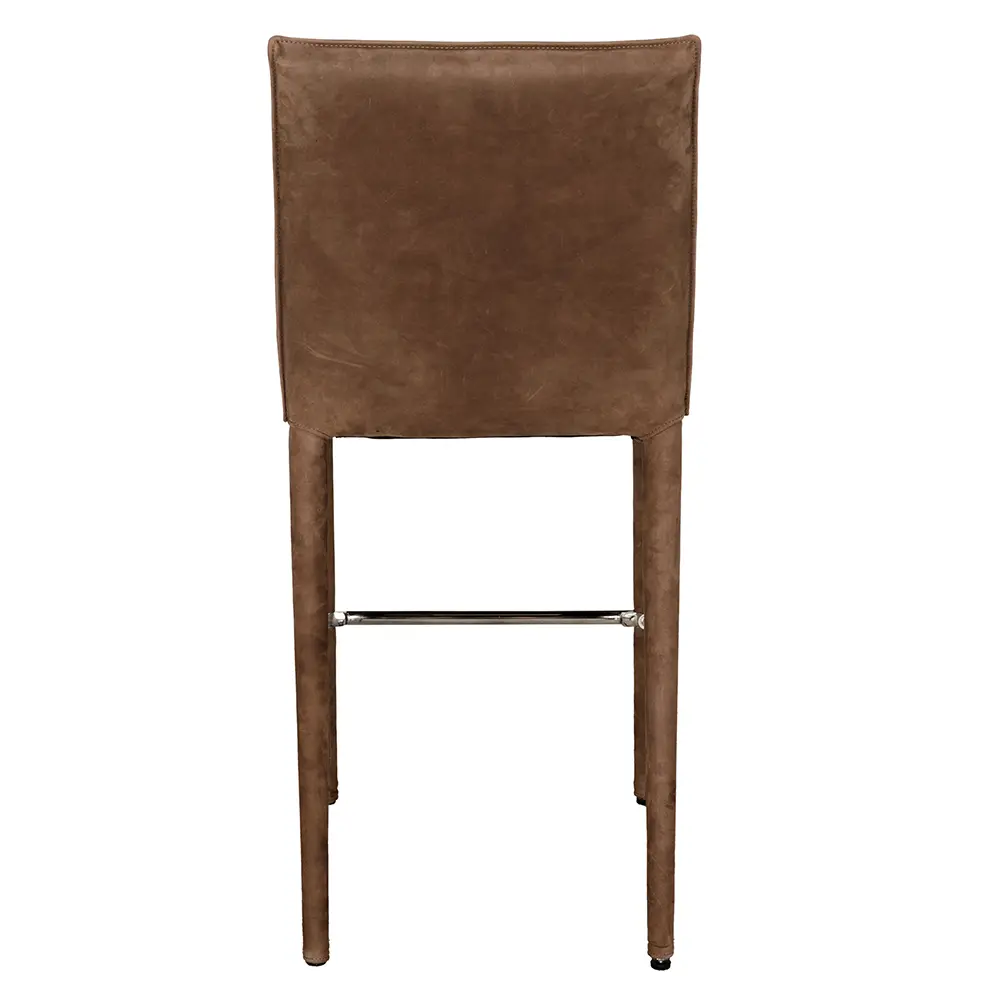 This contemporary counter-height stool features a minimalist design with clean lines, and it comes fully upholstered in rich Orris Brown leather. A sleek chrome footrest adds contrast, providing both comfort and understated sophistication for modern interiors.