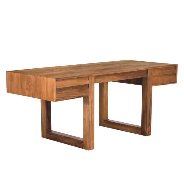 This minimalist teak desk is crafted from natural teak wood, highlighting its beautiful, rich grain. The desk features clean lines that create a simplistic yet sophisticated aesthetic. It includes four louvered side drawers and one central drawer for ample storage.