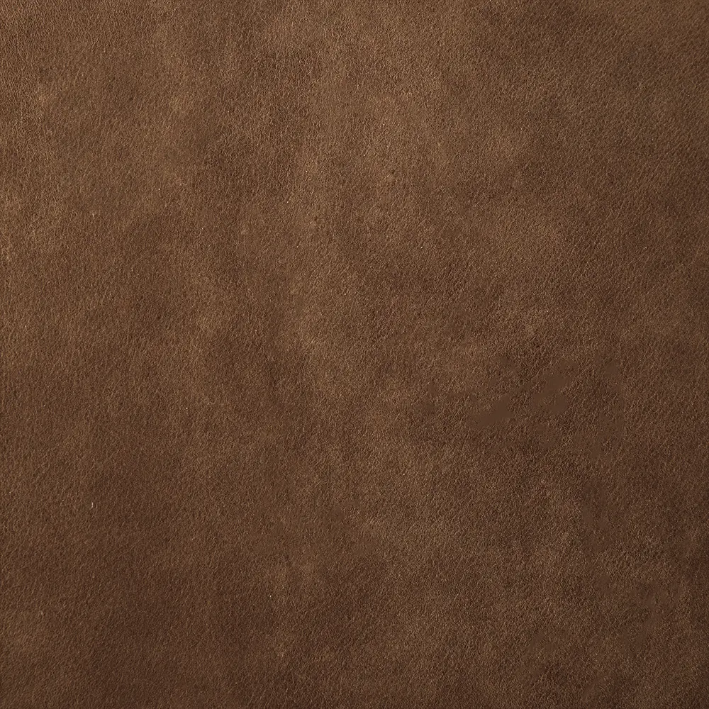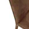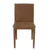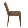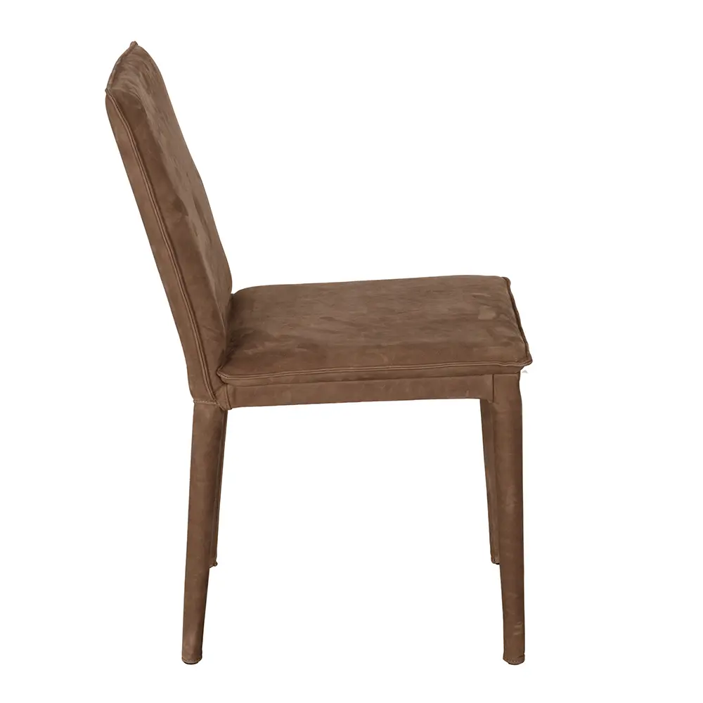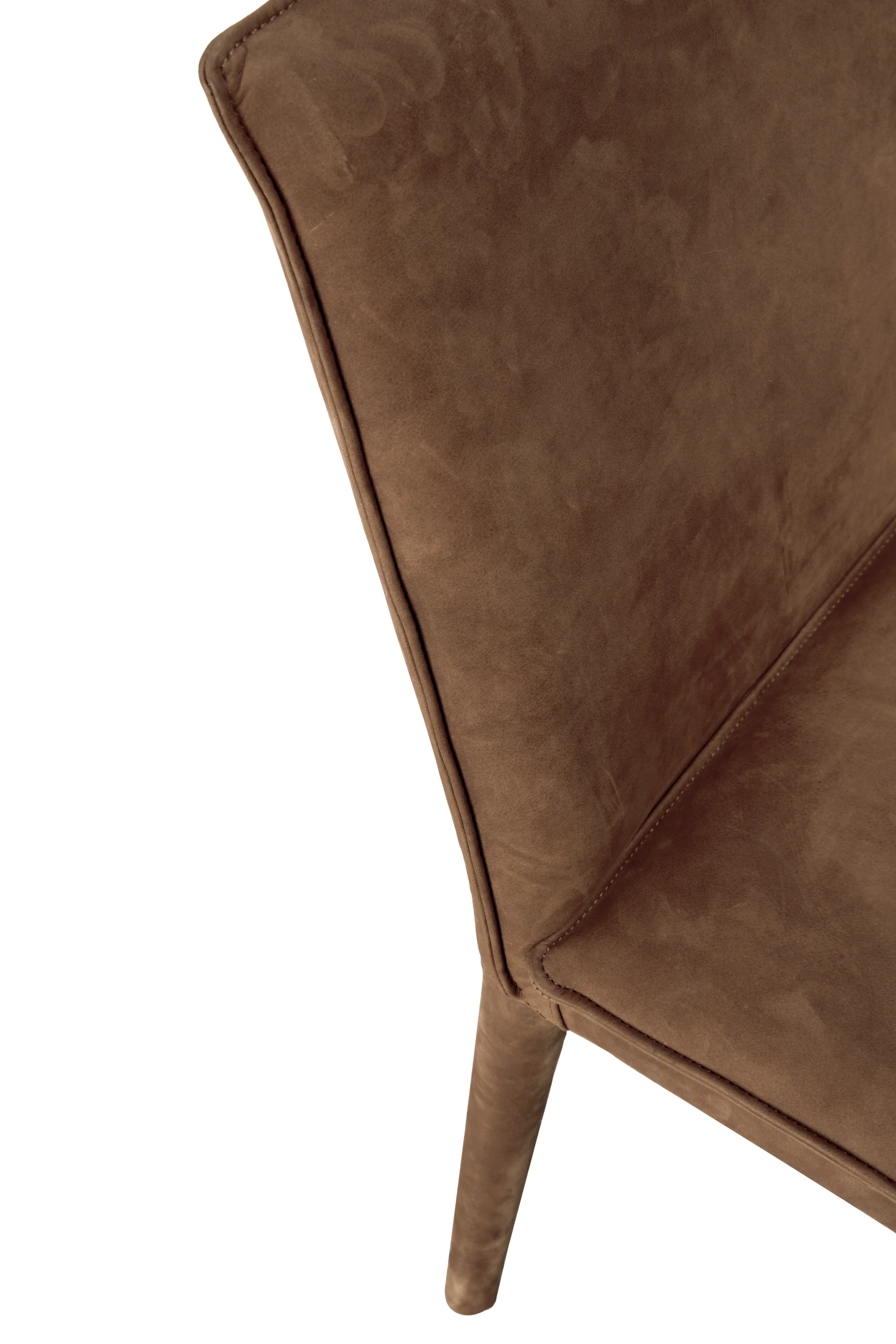 This dining chair features a streamlined, minimalist form with full upholstery in soft brown leather. Its clean lines, tapered legs, and subtle stitching contribute to a contemporary elegance.