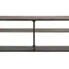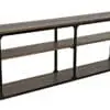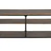This long, narrow, Dark Walnut Finish console table features open shelving with a black metal frame and wood surfaces, offering a sleek, industrial look perfect for storage or display in modern spaces.