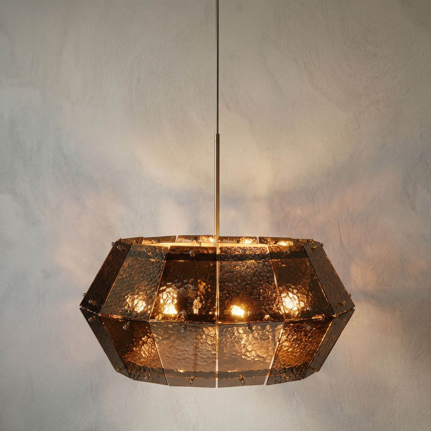 A geometric chandelier featuring hammered smoked-glass panels and polished metal suspension. When unlit, it maintains a sleek, reflective appearance; when illuminated, it emits a warm amber glow. It is ideal for modern, mid-century, or art deco-inspired interiors.