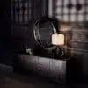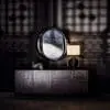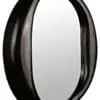 This oversized round wall mirror is over three feet in diameter. The frame is hand-carved from Mindi wood with a Charcoal Black finish.
