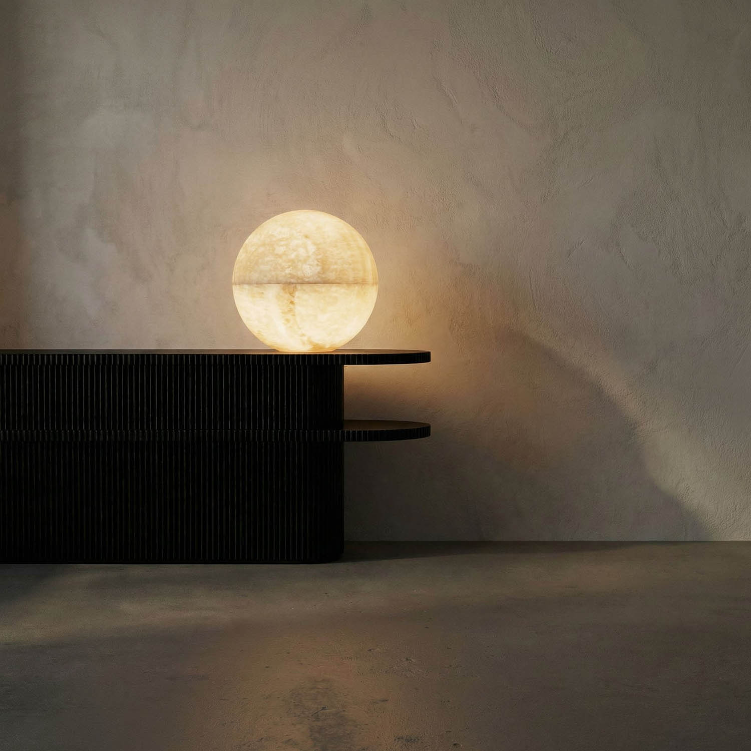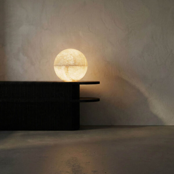 The Onyx Globe lamp, made from beautifully veined onyx, emits a warm, ambient light that enhances the stone’s natural striations. Its smooth spherical shape presents a tranquil, sculptural quality.