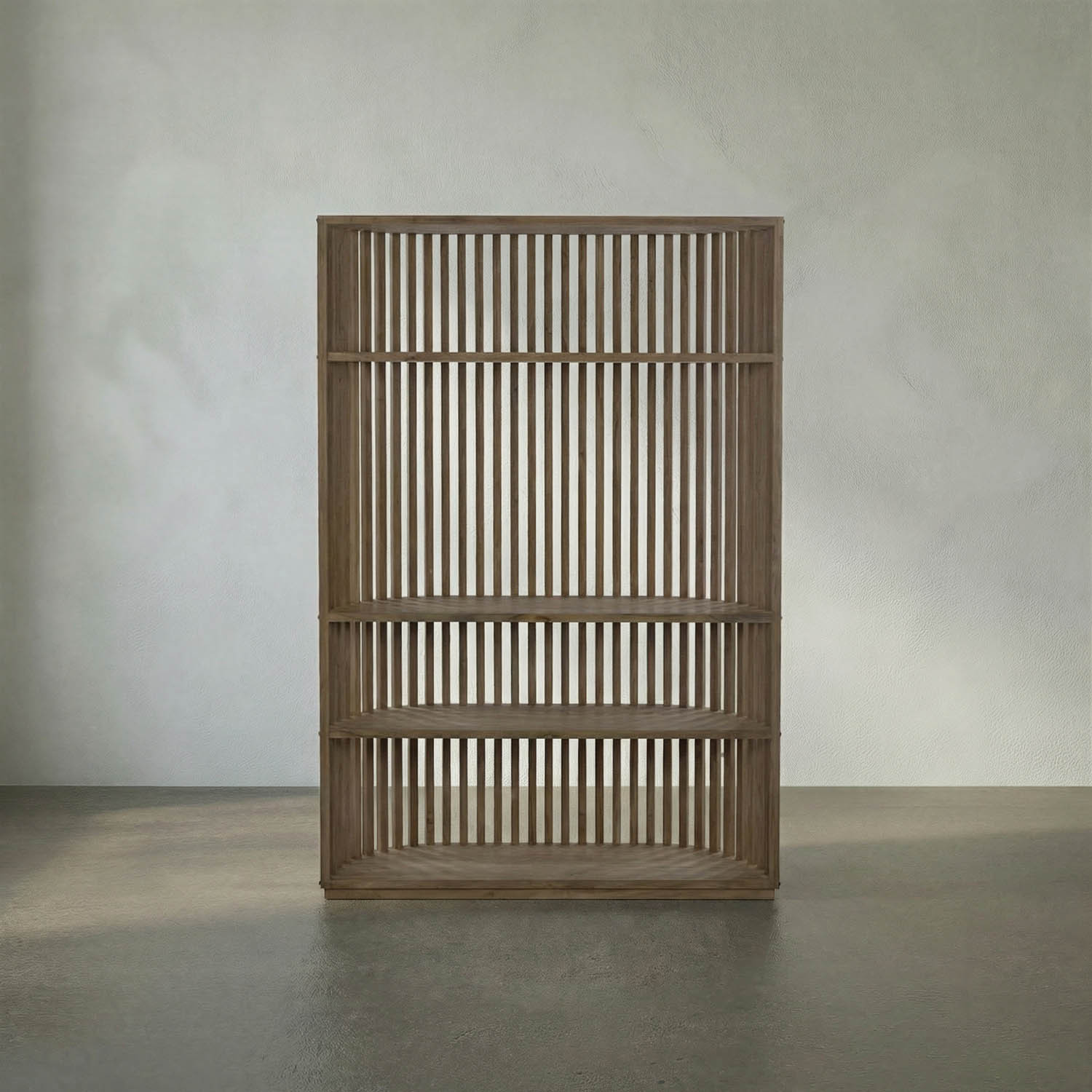 A gently curved back is complemented by perfectly vertical lines on this handmade bookshelf. Fully finished, from the back, you’ll appreciate nailhead accents, and from the front, dramatic vertical lines demand attention.Ê Handcrafted of teak.