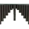 The Organum Coffee Table features a round glass top resting on a sculptural base of graduated iron rods in our Gunmetal finish. Its wing-like design blends industrial sophistication with modern elegance and visual lightness.