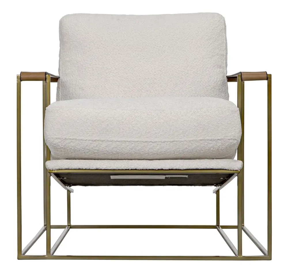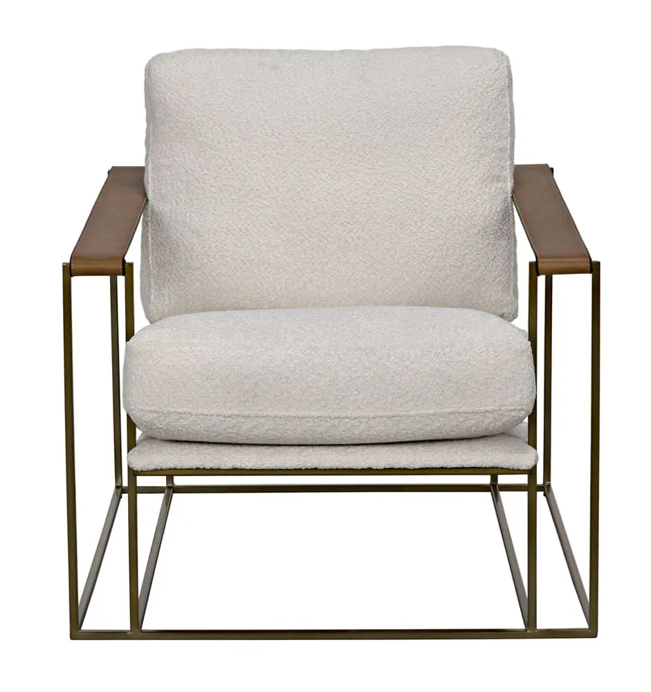 The Oryan Chair features a sleek brass-finished iron frame with open sides and a relaxed seat. It’s upholstered in soft off-white boucle fabric and leather armrests, blending comfort with modern style.