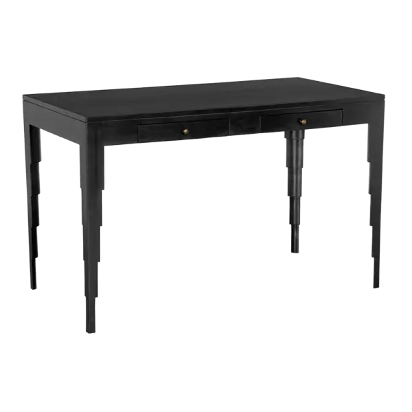 This desk showcases a Hand-Rubbed Black finish, a minimalist silhouette, and sculpturally stepped legs that add subtle architectural drama. Two clean-lined drawers with small brass knobs provide functionality while maintaining a refined, contemporary aesthetic.
