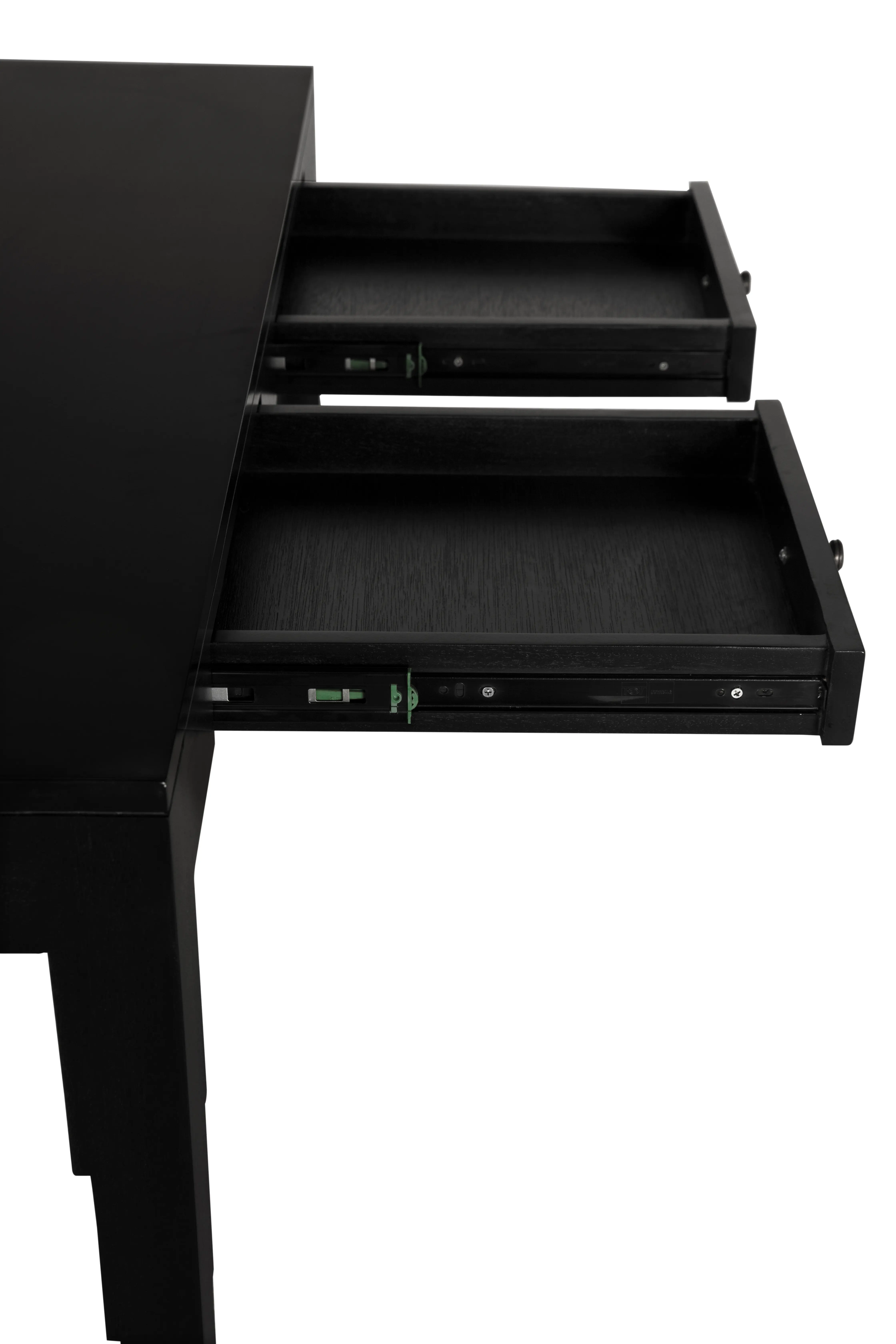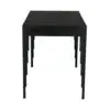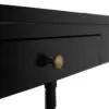 This desk showcases a Hand-Rubbed Black finish, a minimalist silhouette, and sculpturally stepped legs that add subtle architectural drama. Two clean-lined drawers with small brass knobs provide functionality while maintaining a refined, contemporary aesthetic.