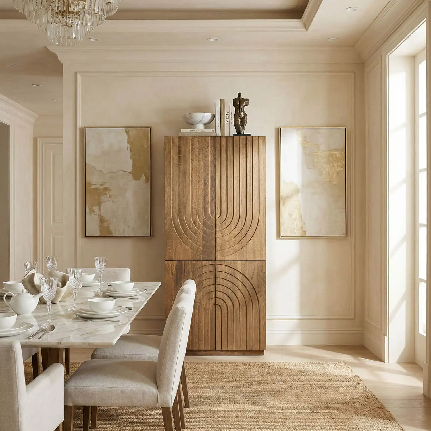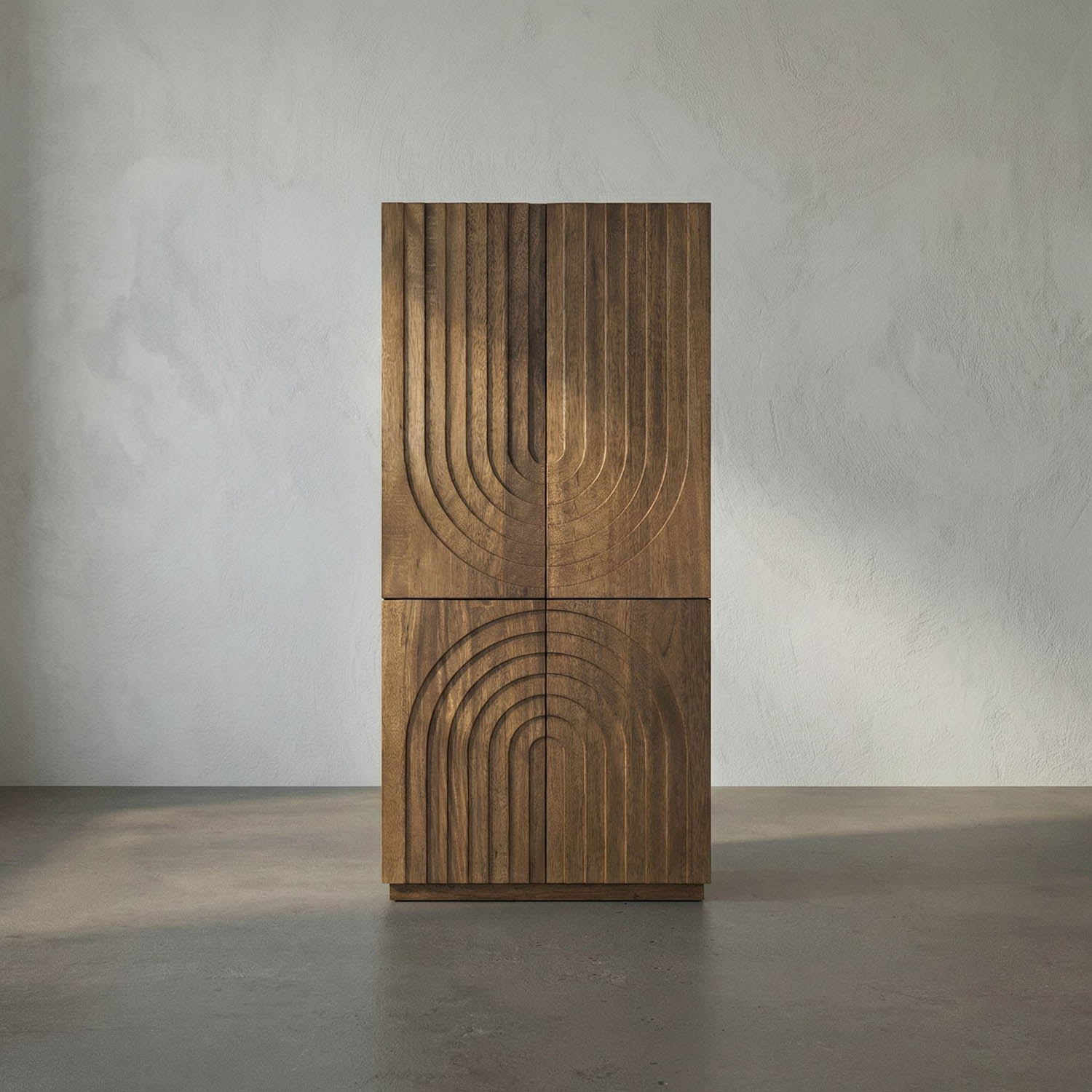 The Otto Hutch, finished in Dark Walnut, showcases clean, minimalist lines with subtle proportions. Its tall, sculptural form provides ample storage while blending timeless craftsmanship with modern simplicity.