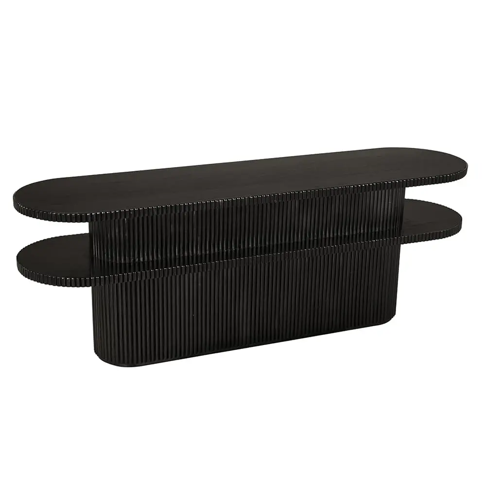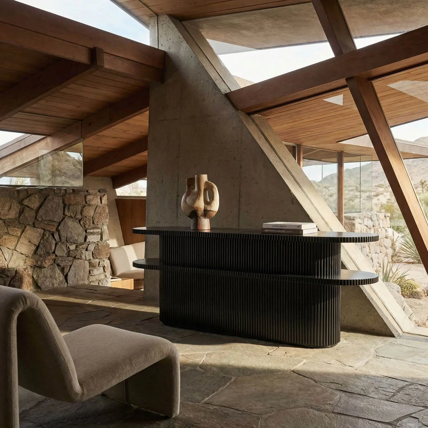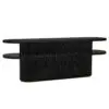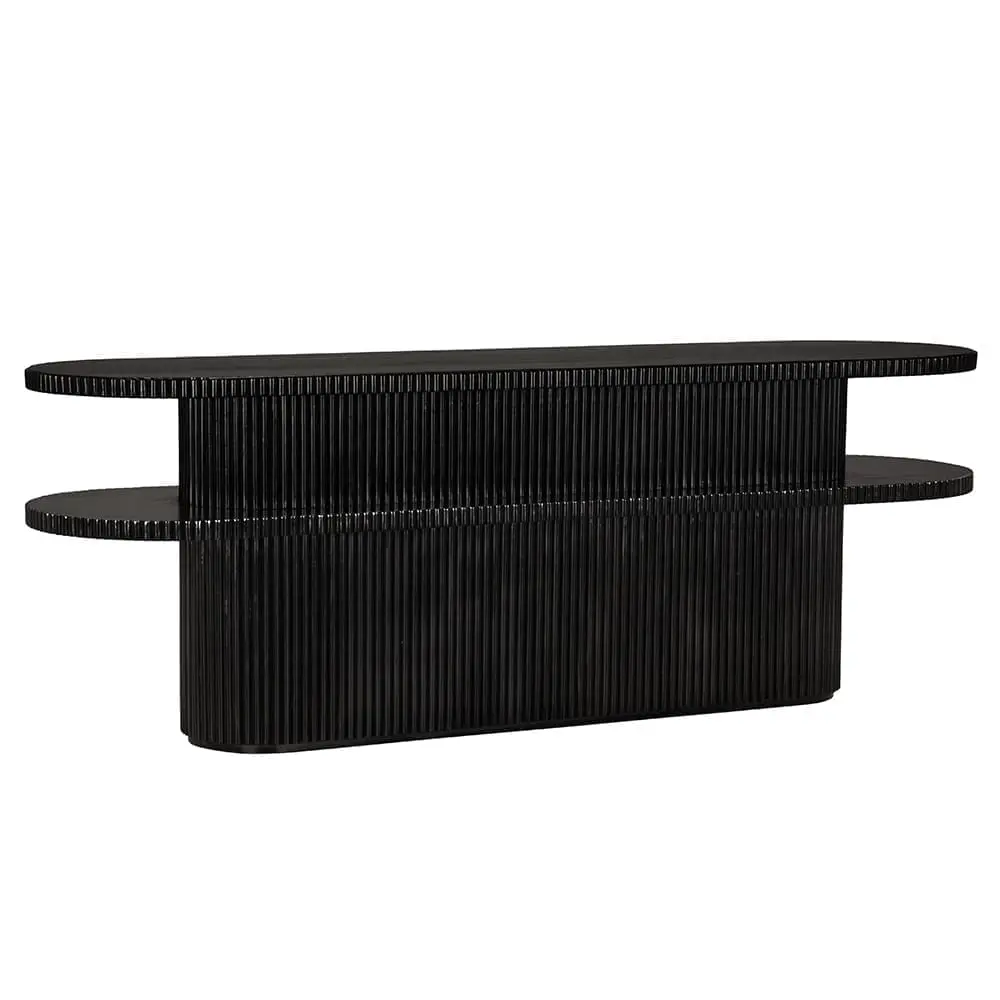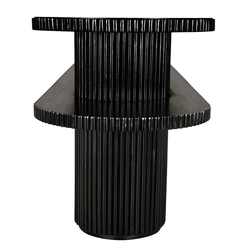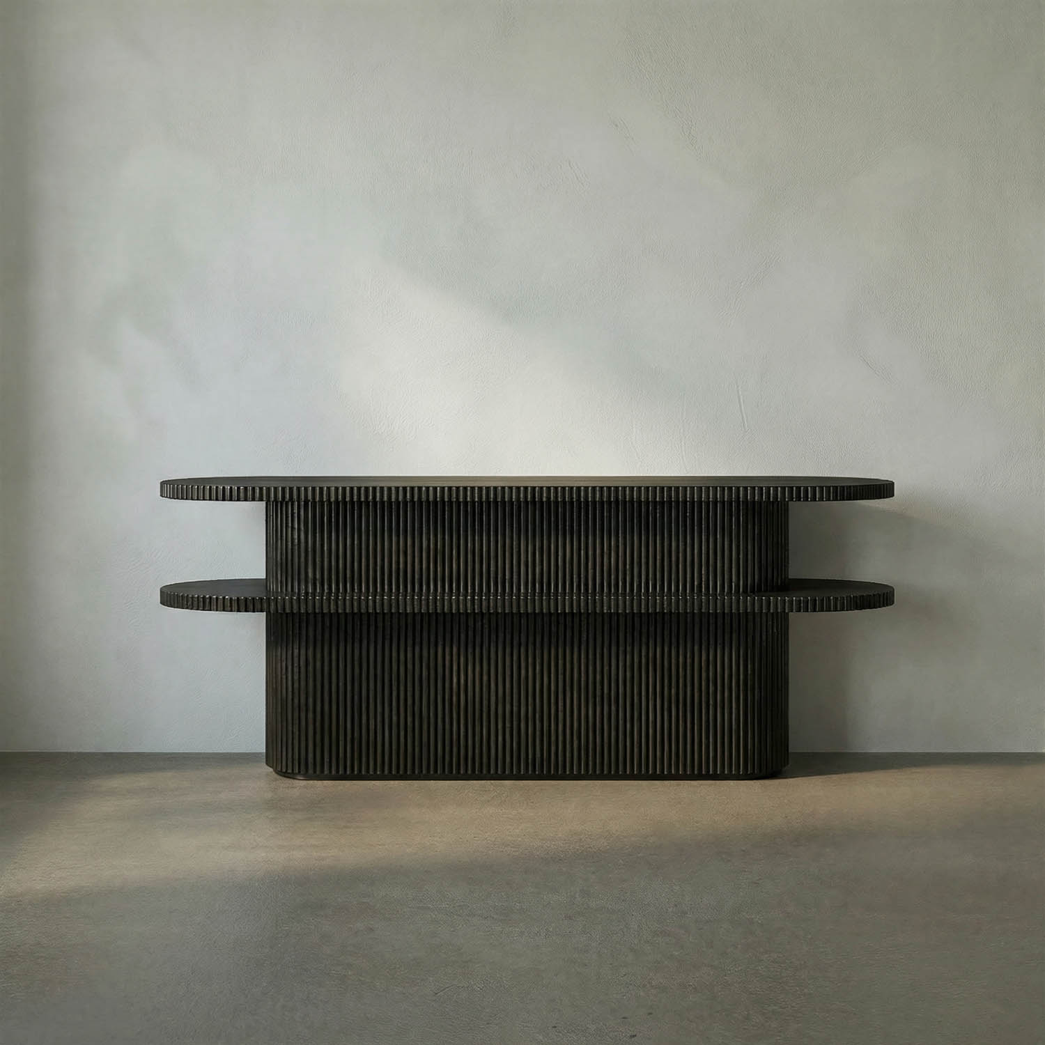 The Parker Console in Hand-Rubbed Black is a striking, sculptural piece made from mahogany, with a fluted base and layered tabletop.