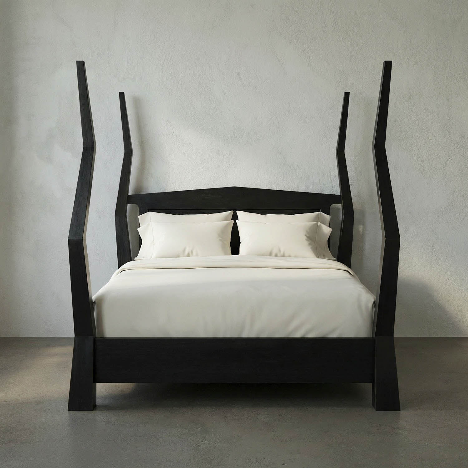 Blending traditional aesthetics with a modern twist, the handcrafted Patras Bed frame in Mahogany finished in a lustrous Hand-Rubbed Black finish features a classic pediment headboard with linear, lightning rod-inspired bedposts.