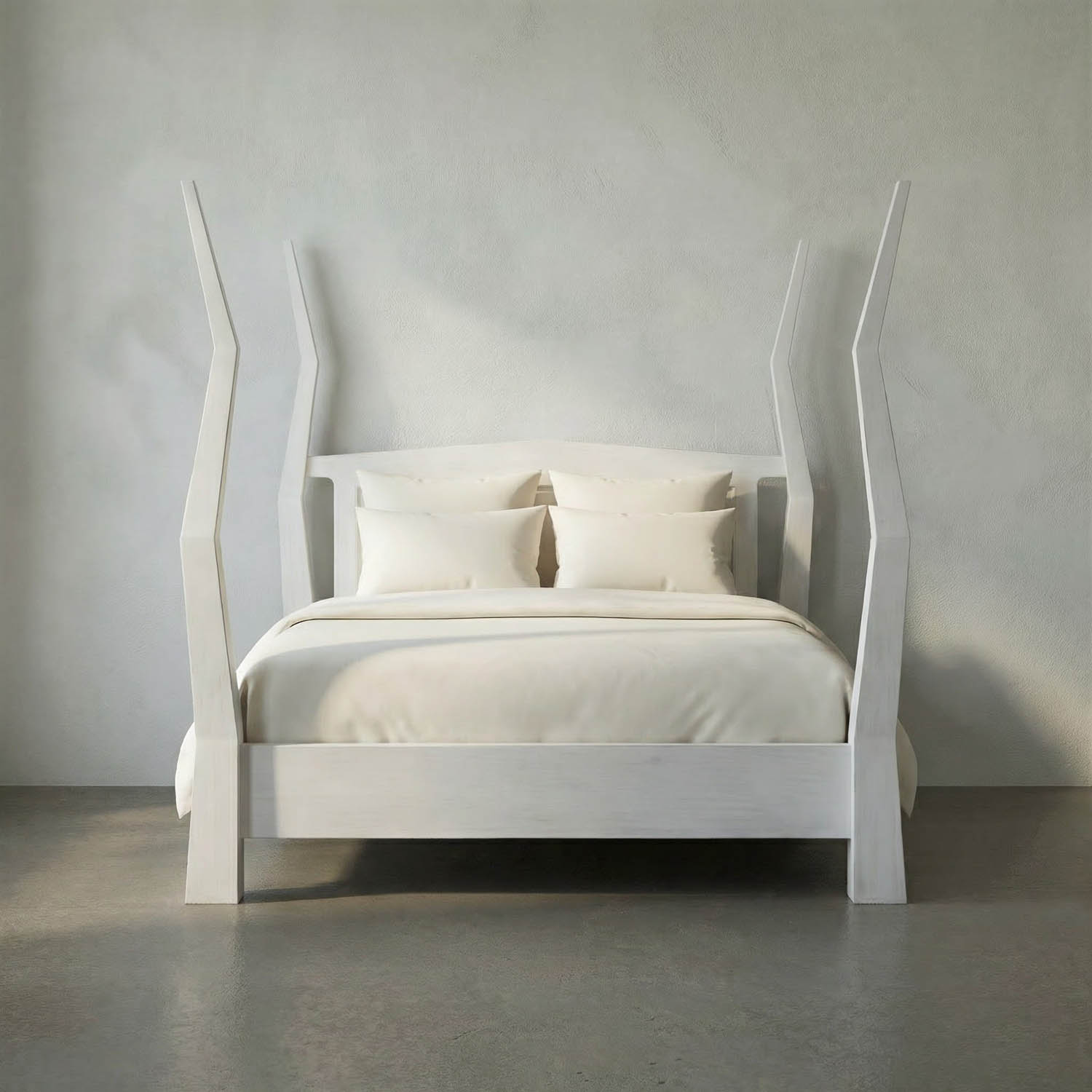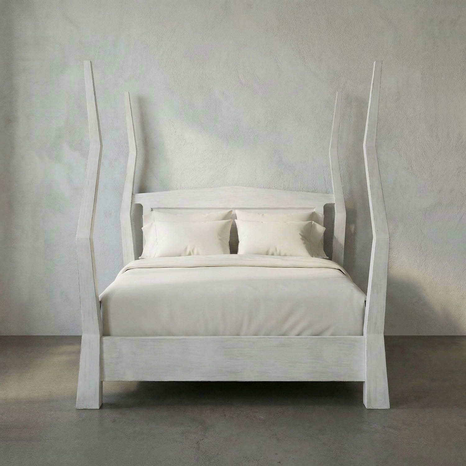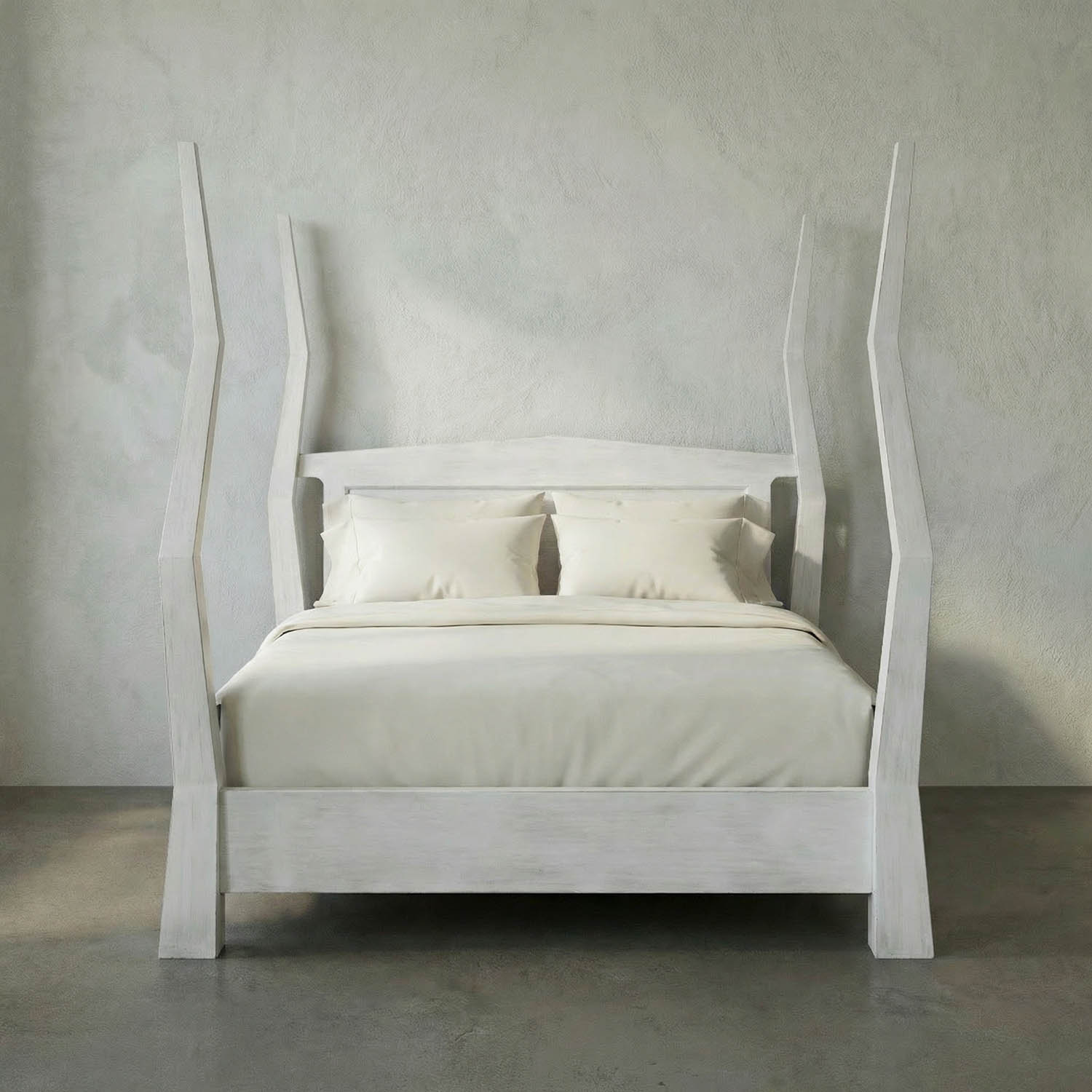 Blending traditional aesthetics with a modern twist, the handmade Patras Bed frame in Mahogany finished in a soft White-Wash finish features a classic pediment headboard with linear, lightning rod-inspired bedposts.