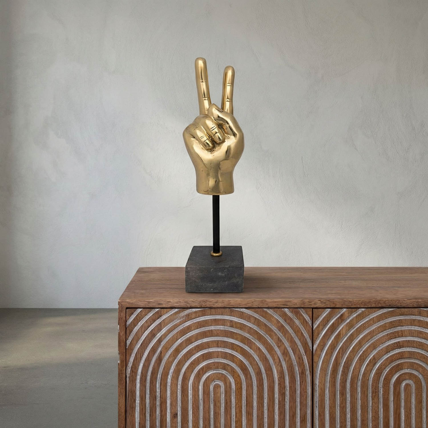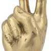 Crafted in a polished brass finish, this hand sculpture features the classic peace sign, radiating a cool and calm vibe.