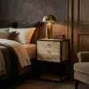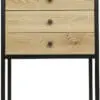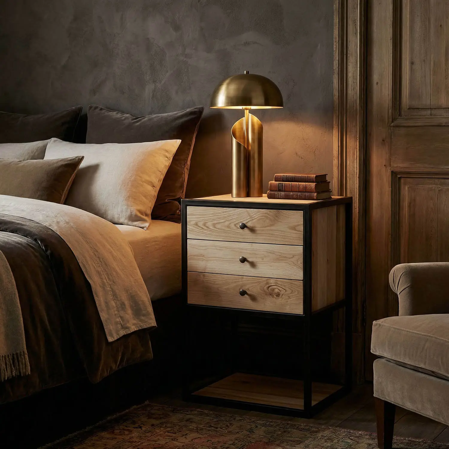 Crafted from elm, this three-drawer side table showcases its natural wood grain complemented by a matte-black iron base. Its minimalist, industrial-inspired design highlights clean lines, merging functionality with understated elegance for versatile use in a variety of spaces.