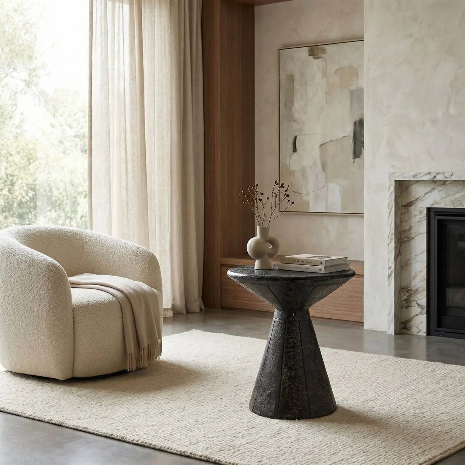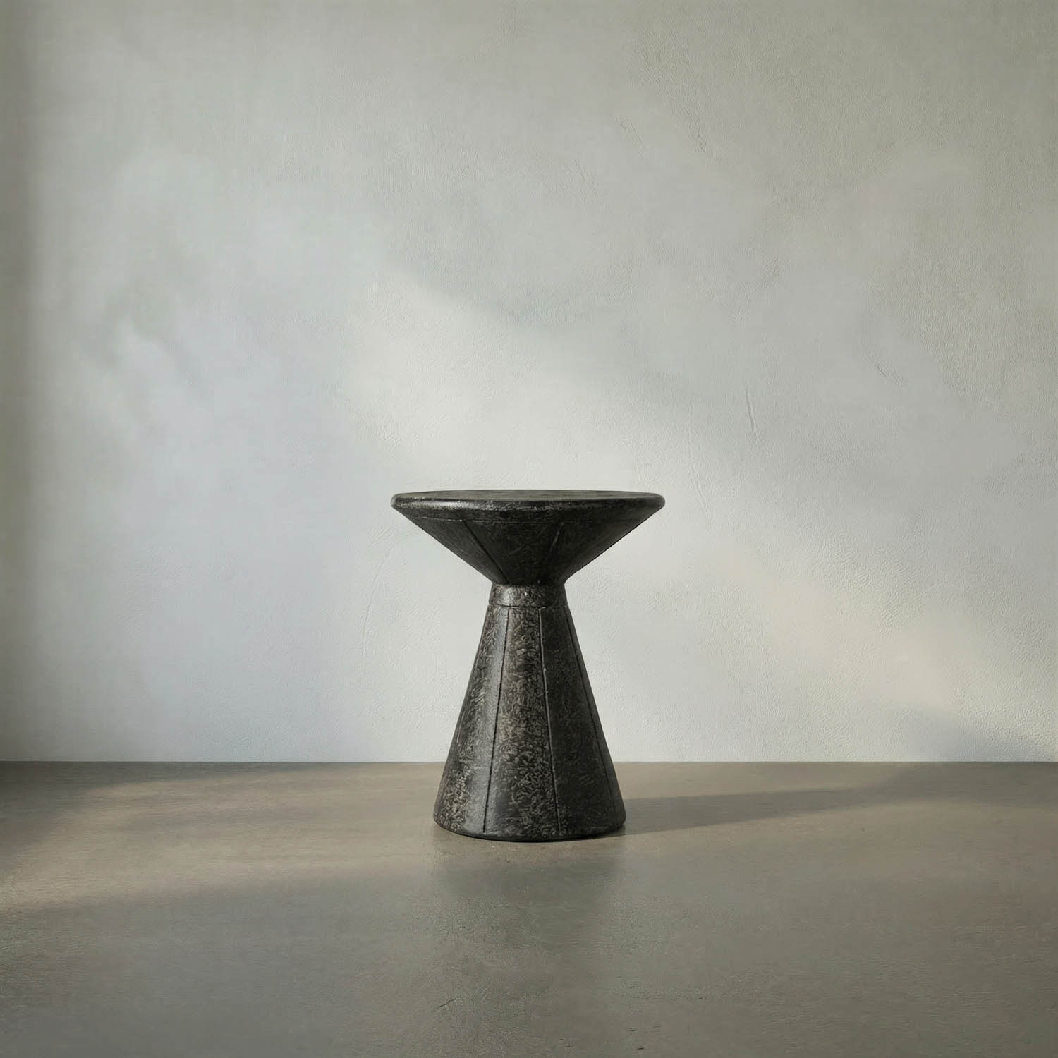 Crafted from fiber cement, a unique material with a rich, natural texture that invites sculptural exploration, this black accent table explores new frontiers in form and space, perfect for accommodating a drink or a book. Handcrafted and finished.