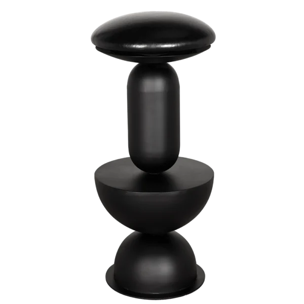 This sculptural swivel bar stool features a bold geometric design comprising stacked symmetrical shapes: a dome, cylinder, sphere, and cone. The arrangement creates a dynamic and visually intriguing structure. Finished in matte black, the stool offers a striking modernist aesthetic and an impressive visual weight.