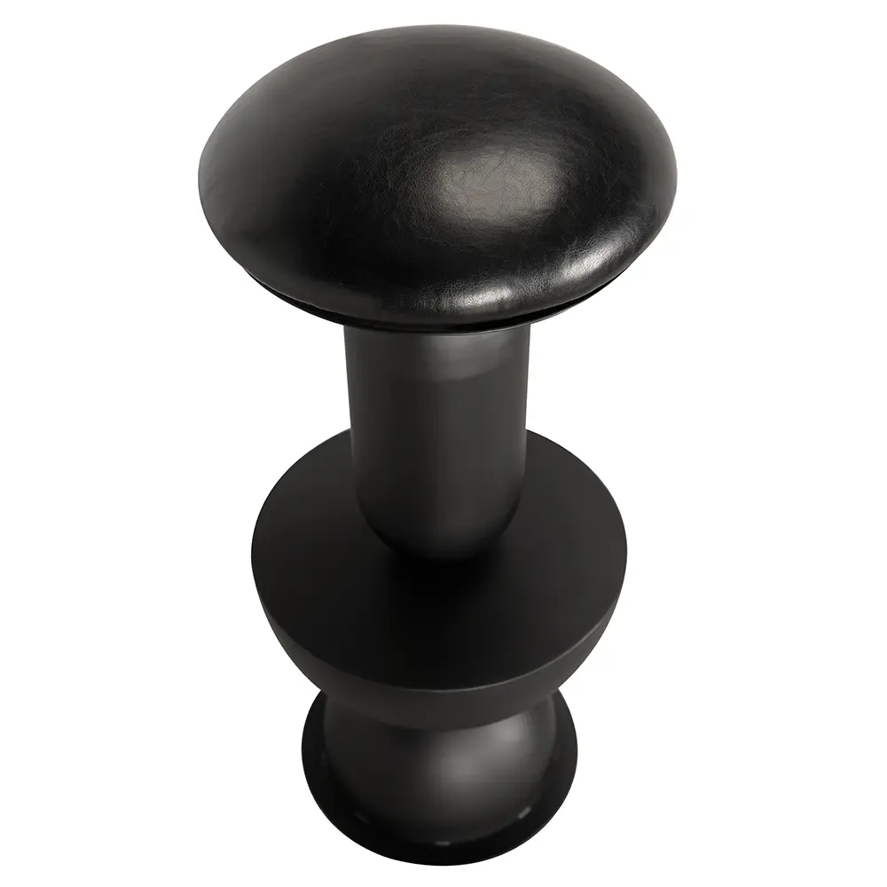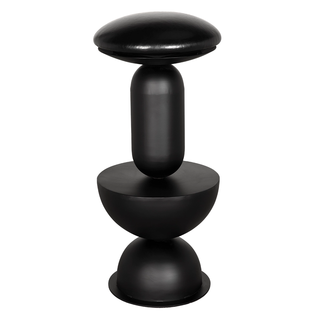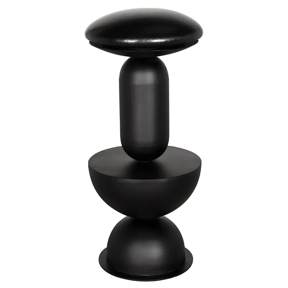 This sculptural swivel bar stool features a bold geometric design comprising stacked symmetrical shapes: a dome, cylinder, sphere, and cone. The arrangement creates a dynamic and visually intriguing structure. Finished in matte black, the stool offers a striking modernist aesthetic and an impressive visual weight.