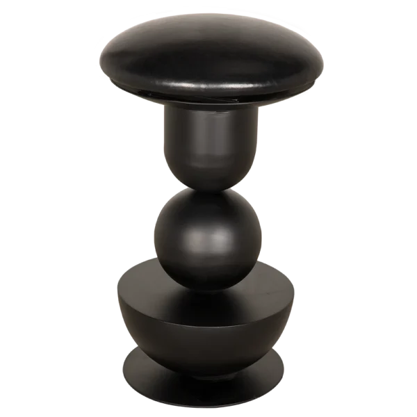 This sculptural swivel counter stool features a bold geometric design comprising stacked symmetrical shapes: a dome, cylinder, sphere, and cone. The arrangement creates a dynamic and visually intriguing structure. Finished in matte black, the stool offers a striking modernist aesthetic and an impressive visual weight.