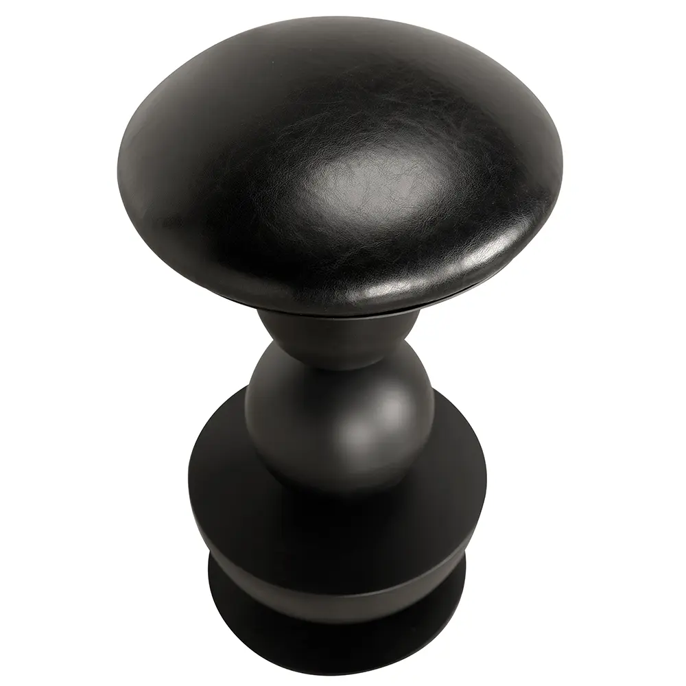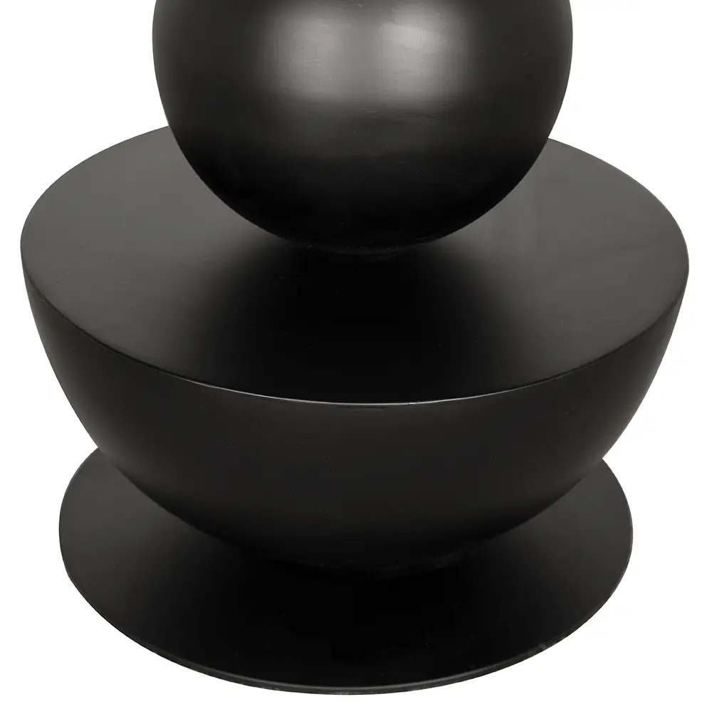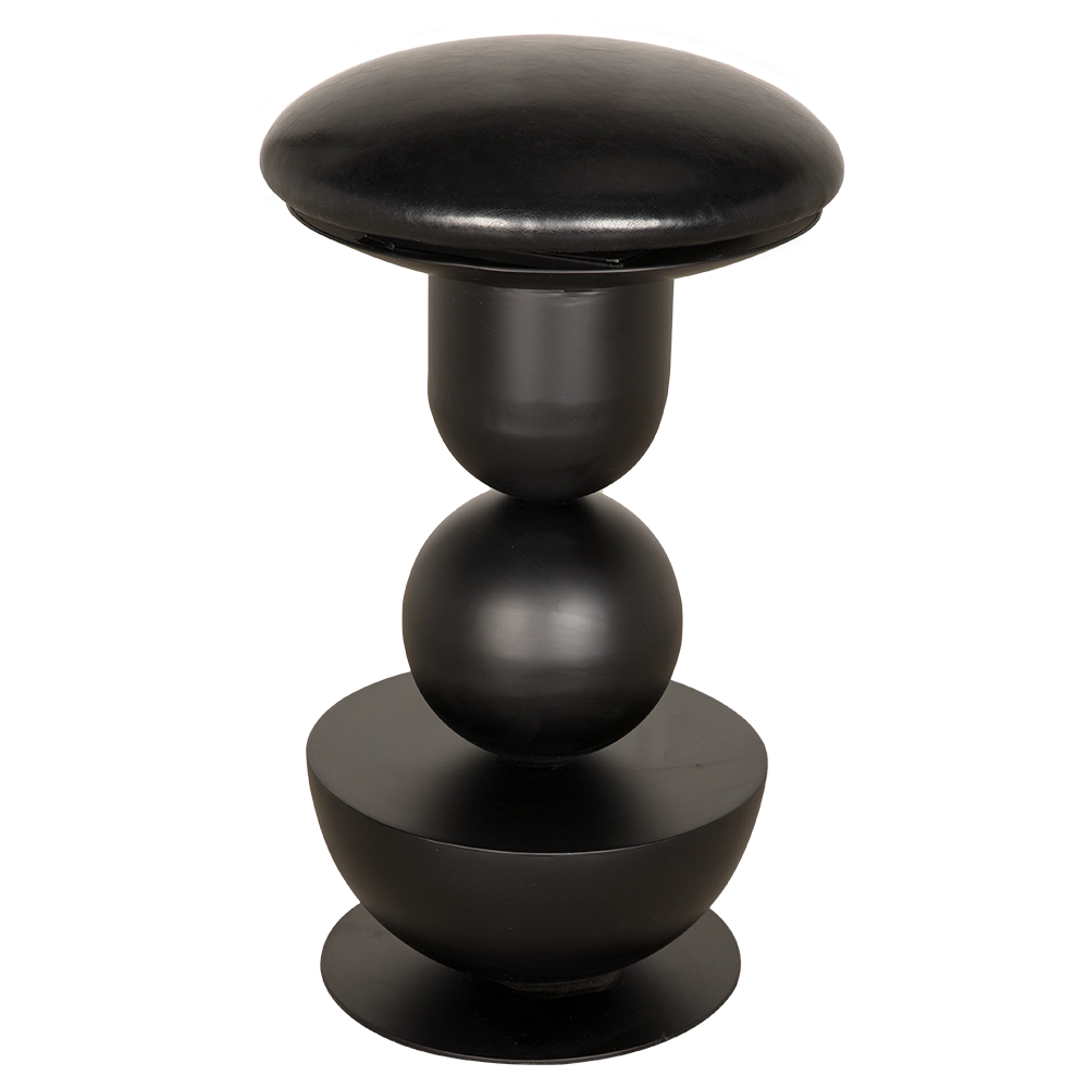 This sculptural swivel counter stool features a bold geometric design comprising stacked symmetrical shapes: a dome, cylinder, sphere, and cone. The arrangement creates a dynamic and visually intriguing structure. Finished in matte black, the stool offers a striking modernist aesthetic and an impressive visual weight.