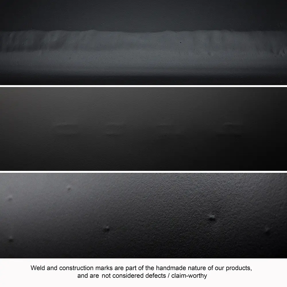 Noir's metal items feature a rustic, handcrafted appearance that may include visible welding marks, surface irregularities, or gaps at weld points. These characteristics are inherent to the design and production process and are not considered defects or grounds for claims.