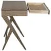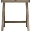 This Washed Walnut finished side table features a minimalist design with a single drawer for simple storage. Its sleek silhouette and compact size make it perfect for various spaces.