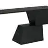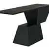 The Pieta Console is a distinctive piece that merges industrial design with sculptural elegance. Its design features bold geometric forms, with a single angular pedestal supporting the surface plane, creating dramatic negative space underneath.