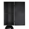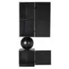 The Matte-Black cabinet features a tall rectangular top and a square base separated by a sphere, creating a striking design with geometric symmetry that blends form and function while offering dramatic contrast and balance.