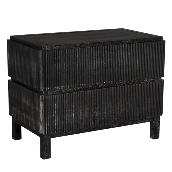This two-drawer side table showcases vertical ribbed detailing in a deep black finish, elevated on minimal block legs merging modern texture with architectural simplicity for a bold, sculptural statement.