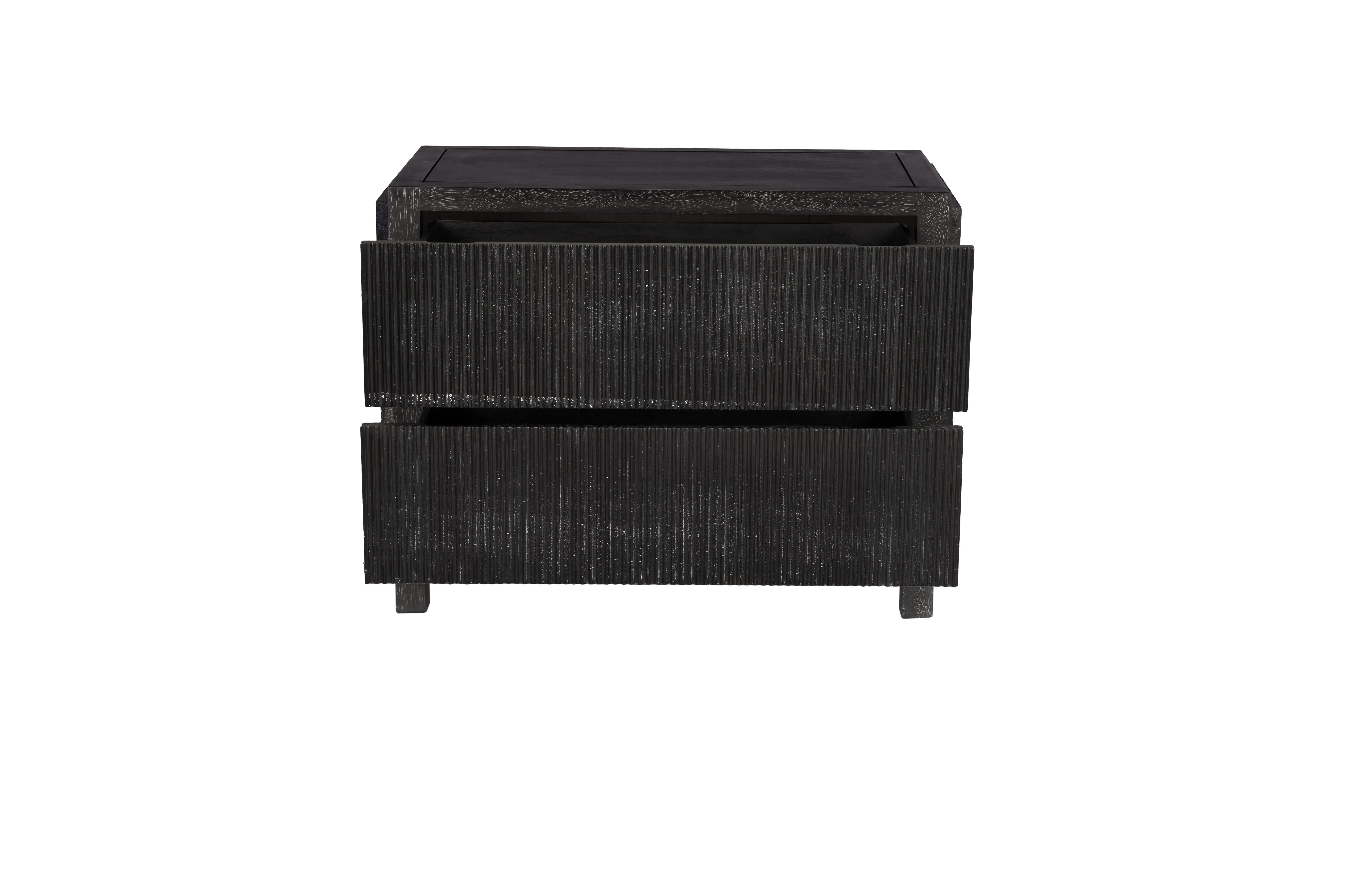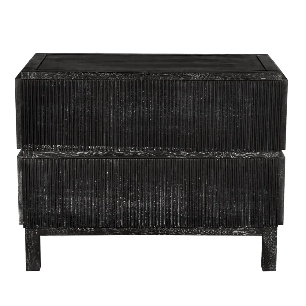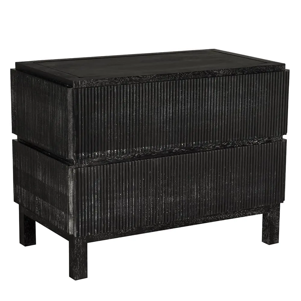 This two-drawer side table showcases vertical ribbed detailing in a deep black finish, elevated on minimal block legs merging modern texture with architectural simplicity for a bold, sculptural statement.