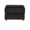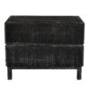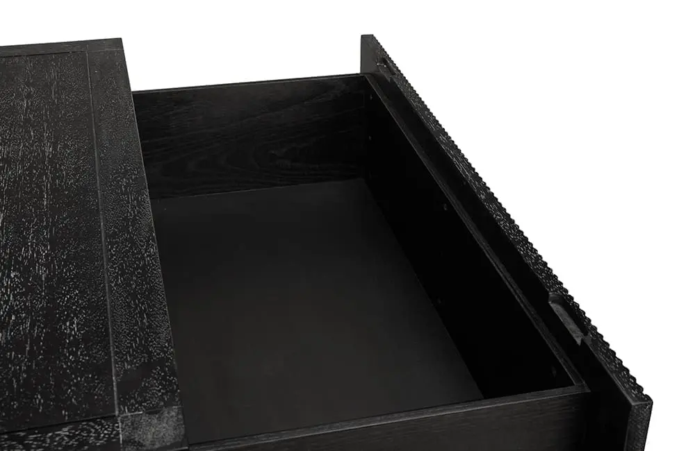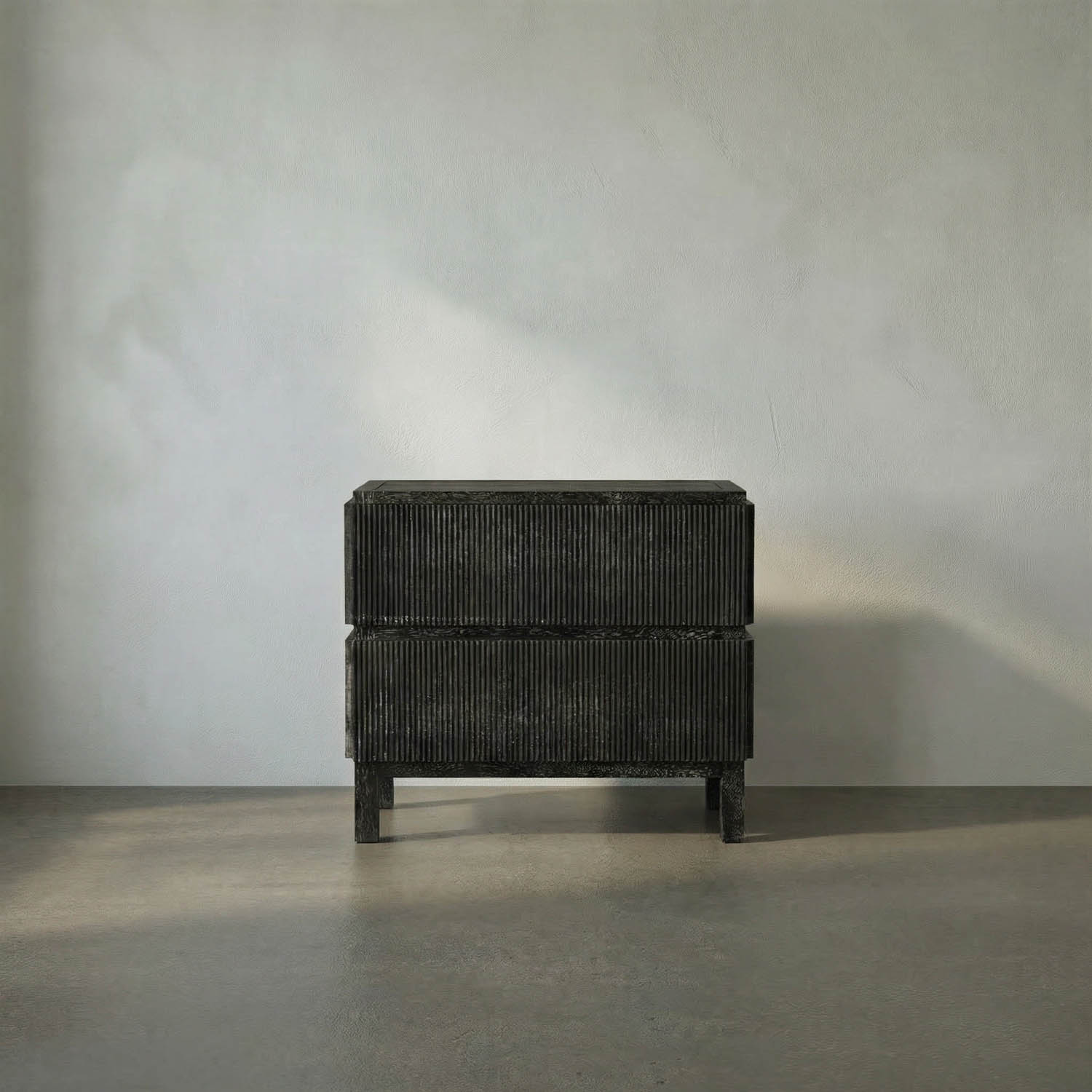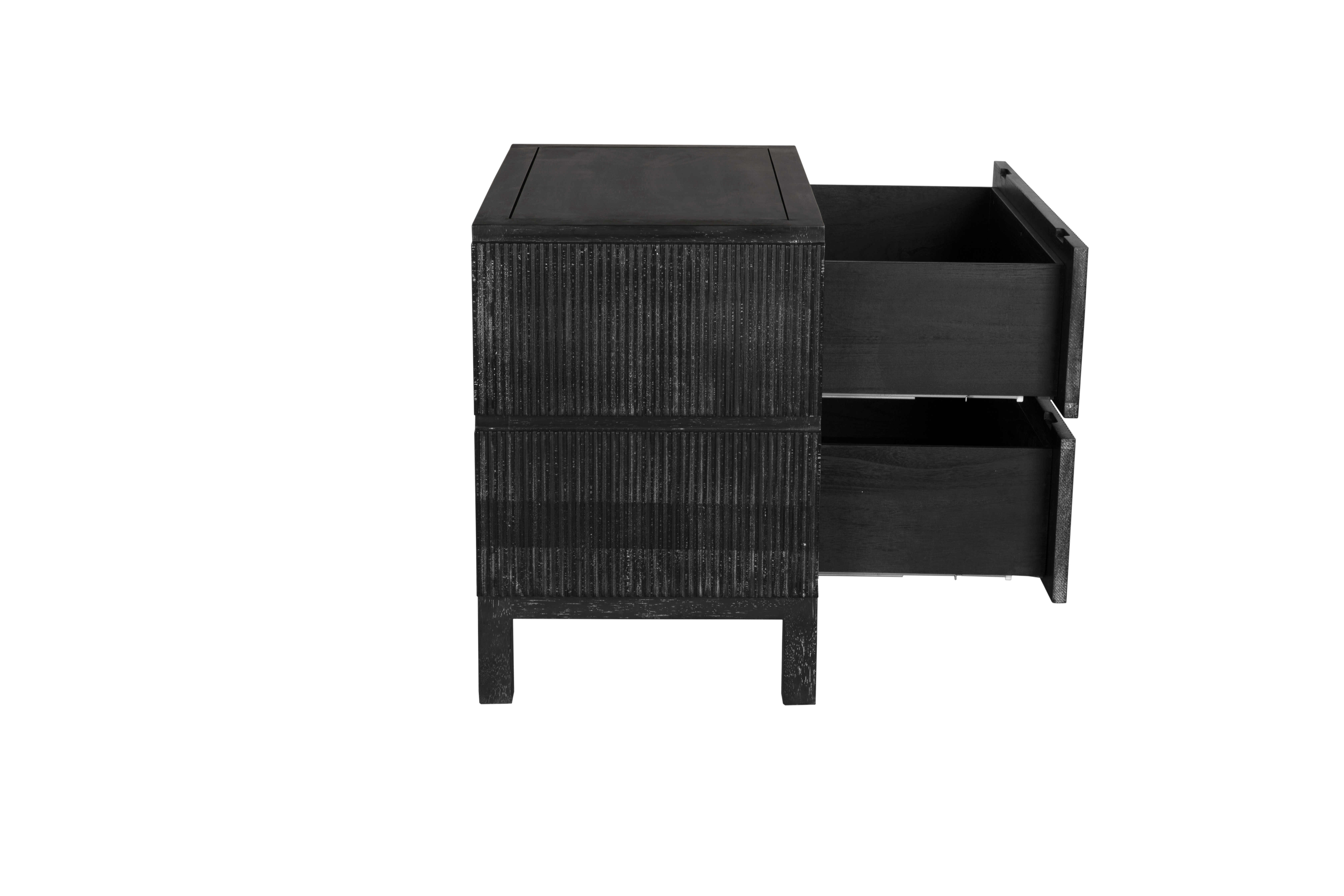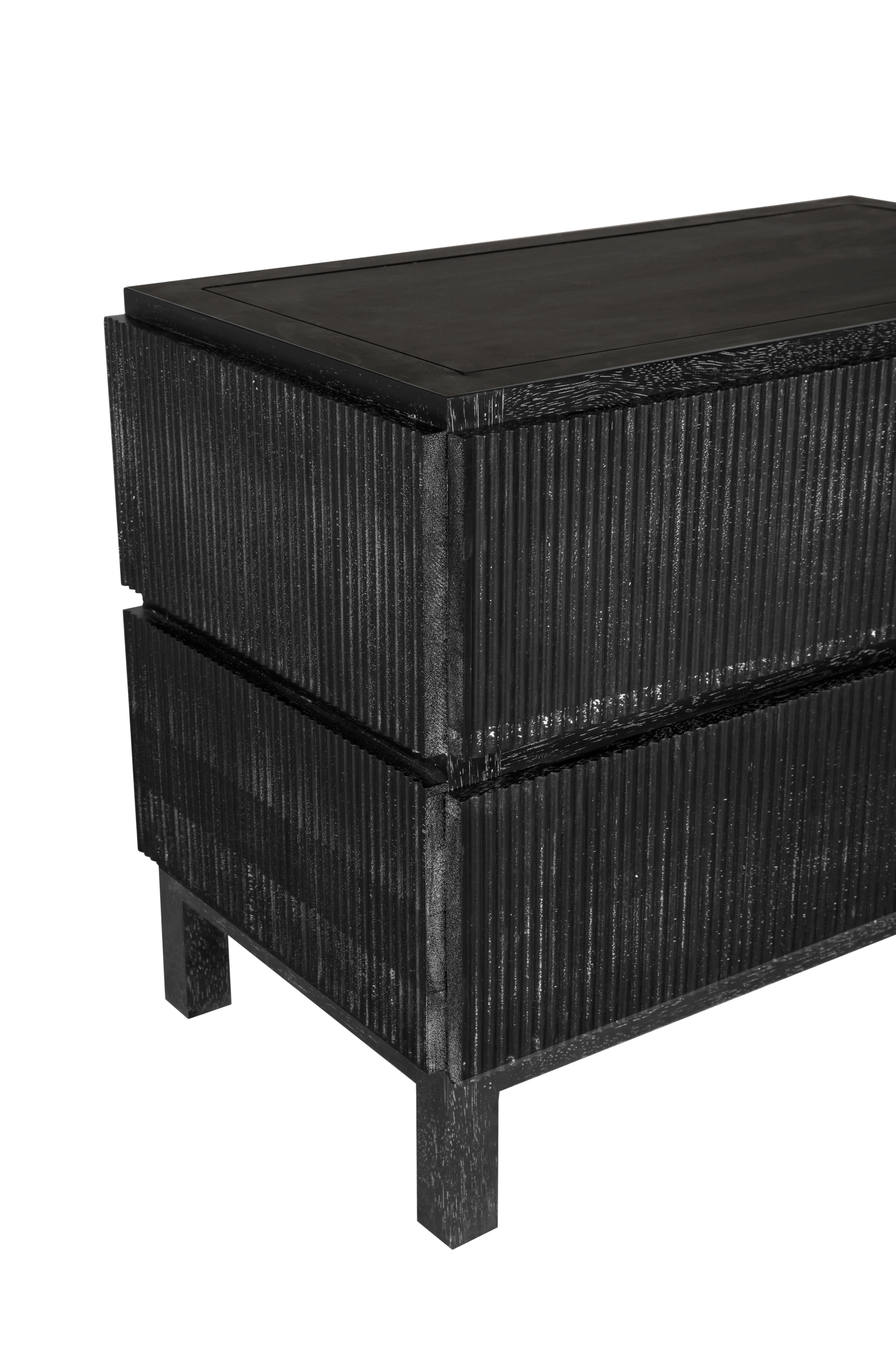 This two-drawer side table showcases vertical ribbed detailing in a deep black finish, elevated on minimal block legs merging modern texture with architectural simplicity for a bold, sculptural statement.