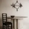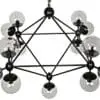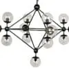A large, celestial-inspired chandelier with 13 glass globes orbiting a diamond-shaped matte black iron frame. Its dramatic scale, sculptural geometry, and ambient glow create an architectural focal point in modern or transitional interiors.