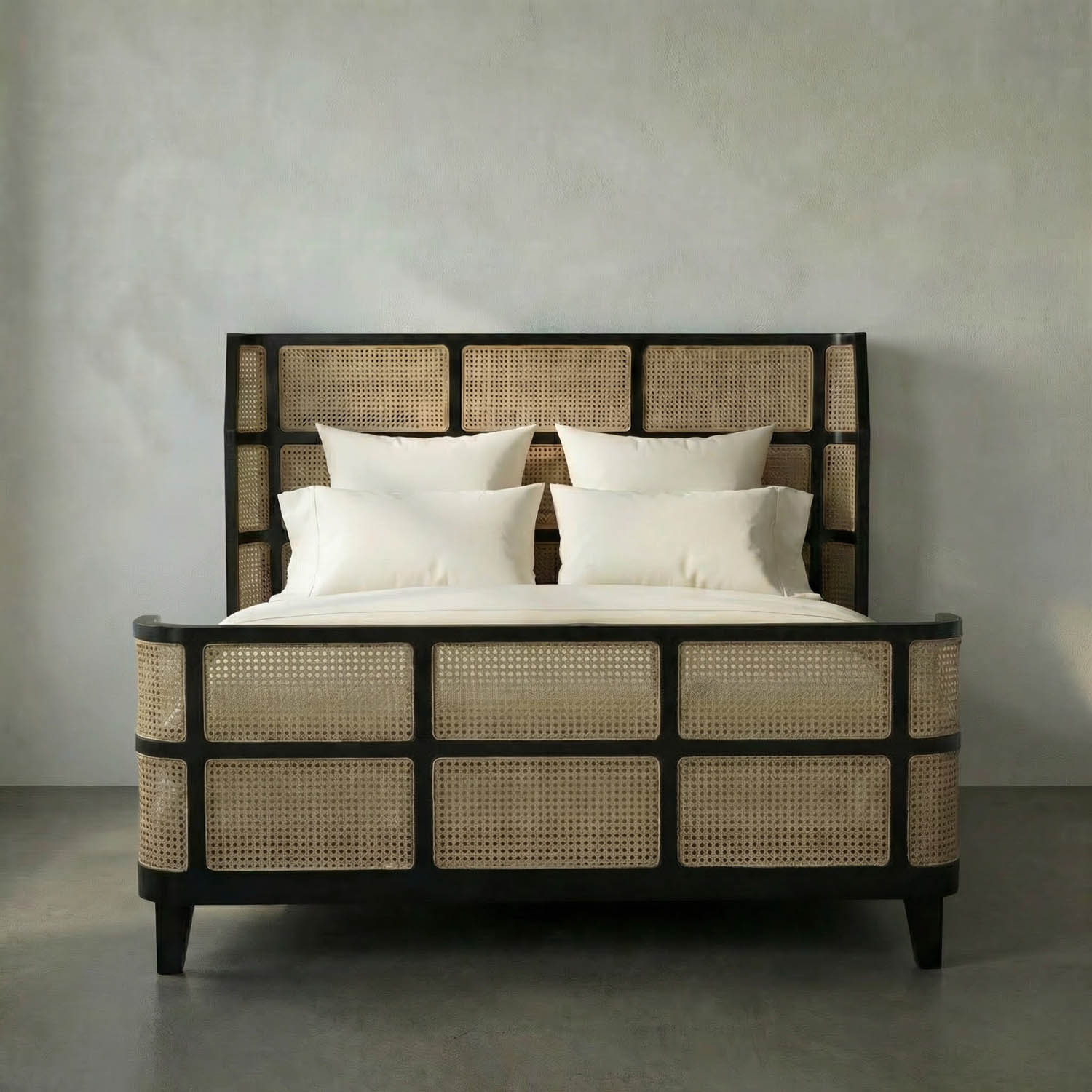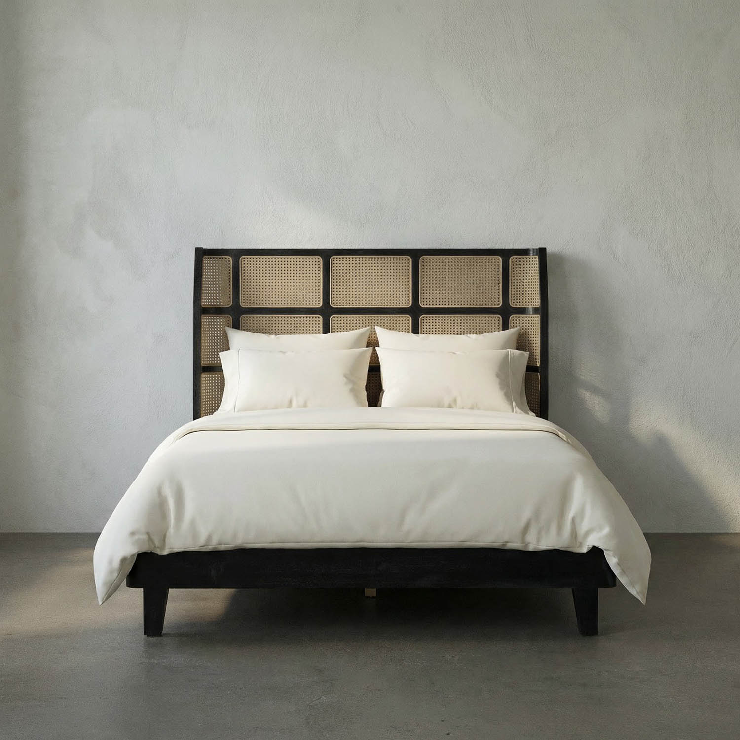 Mahogany, paired with our Hand-Rubbed Black finish, contrasts strikingly with squares of naturally finished caning, creating a beautiful bed. The Head and footboards gently curve inward, creating a cradle-like comfort.