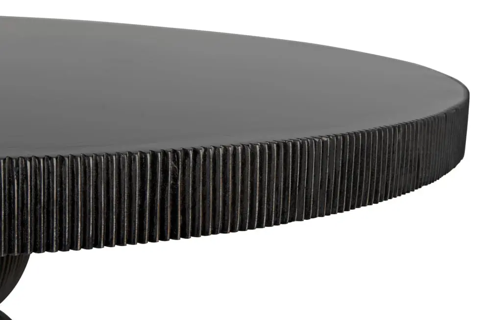 A round mahogany table with a ribbed sculptural body and a cinched tassel-shaped base is finished in Hand-Rubbed Black with Light Brown highlights, making it an artistic and elegant centerpiece for modern and transitional spaces.