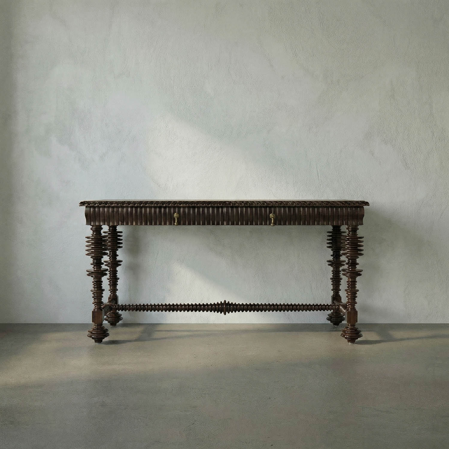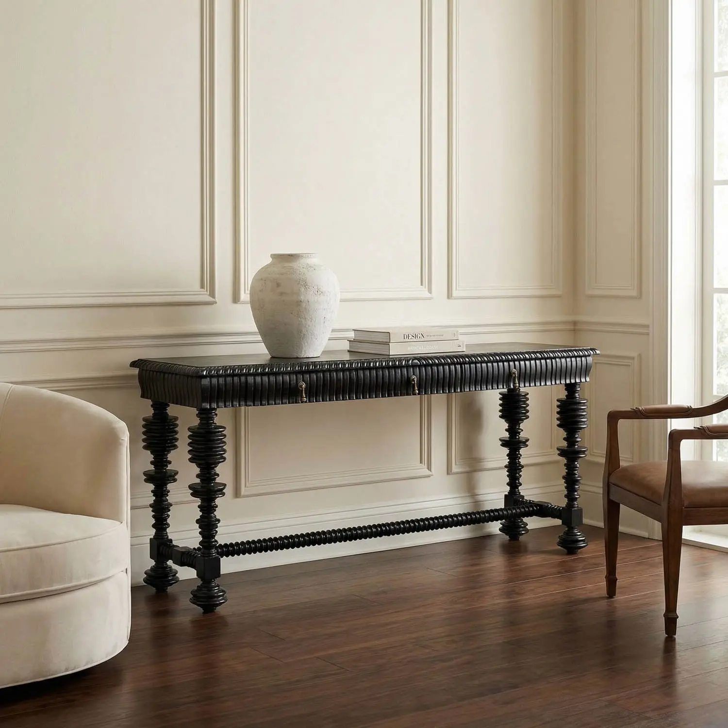 The Portuguese Console features intricately turned spool legs and detailed carvings on a Hand-Rubbed Black mahogany frame. It includes three drawers with solid brass pulls, showcasing classic craftsmanship in a refined traditional design.