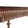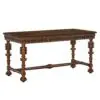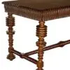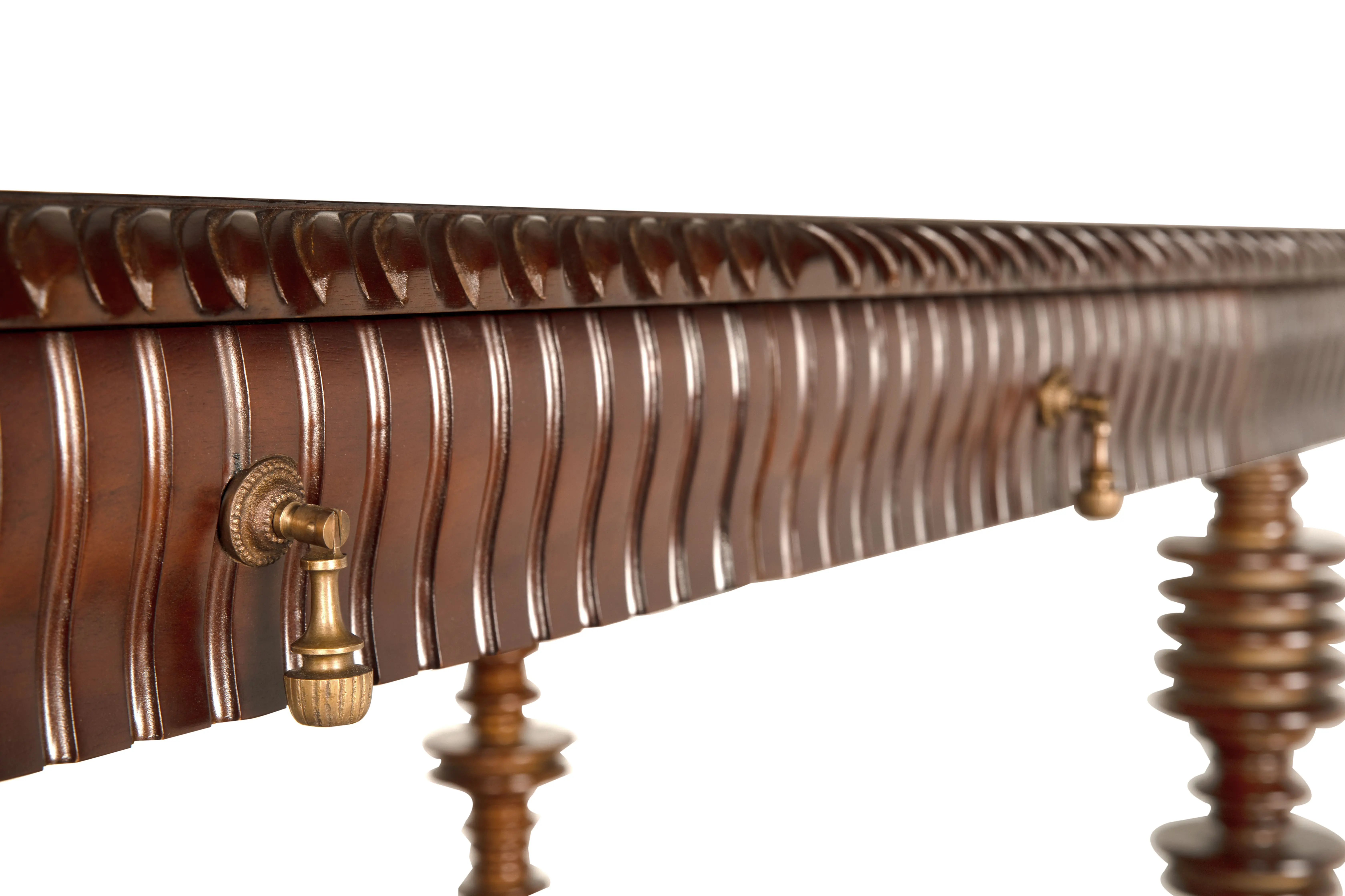 This Spanish Revival-style two-drawer writing desk boasts boldly turned legs, a carved apron, and a rich brown finish. With solid brass hardware, it combines Baroque influences and traditional craftsmanship for an elegant statement piece.