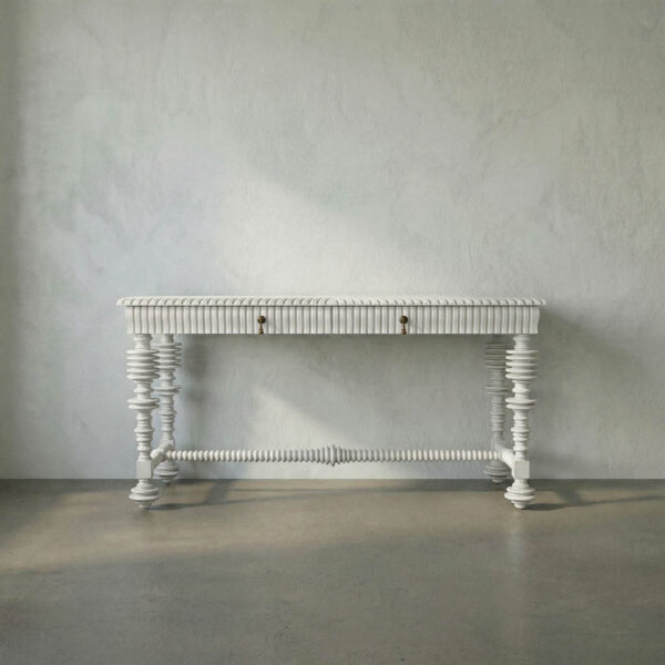 The Portuguese Desk in Solid White showcases classic spool-turned legs, a beautifully carved apron, and a distressed finish. It includes three drawers equipped with solid brass pulls, reflecting traditional European style.