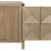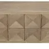 A sculptural walnut two-door sideboard in Washed Walnut features a geometric facade with diamond-shaped pyramid panels. Its minimal silhouette, simple squared legs, and push-latch doors emphasize the bold, textured design while offering a fixed shelf.