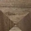A sculptural walnut three-door sideboard in Dark Walnut features a geometric facade with diamond-shaped pyramid panels. Its minimal silhouette, simple squared legs, and push-latch doors emphasize the bold, textured design while offering a fixed shelf.