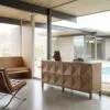 A sculptural walnut three-door sideboard in Washed Walnut features a geometric facade with diamond-shaped pyramid panels. Its minimal silhouette, simple squared legs, and push-latch doors emphasize the bold, textured design while offering a fixed shelf.