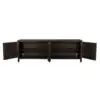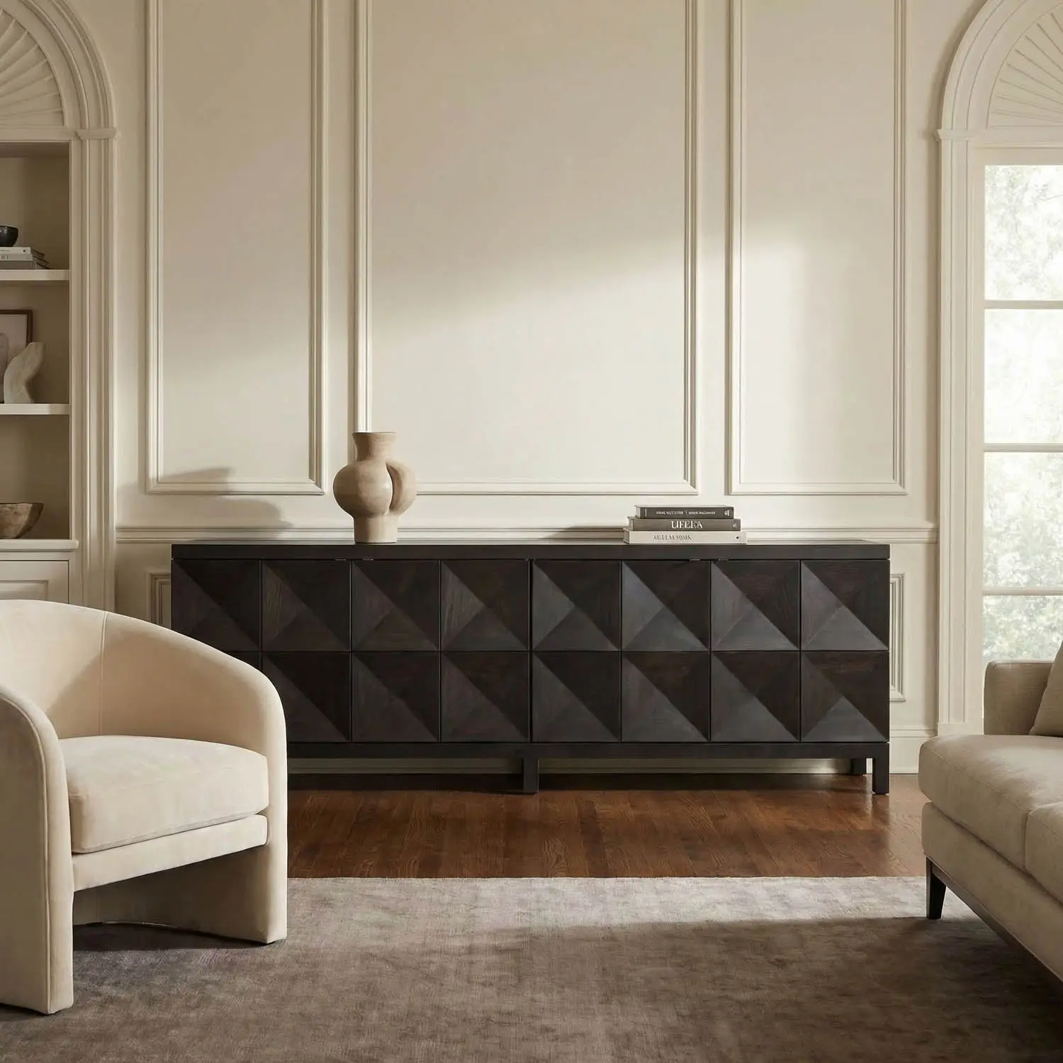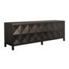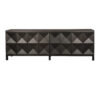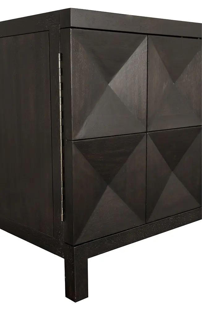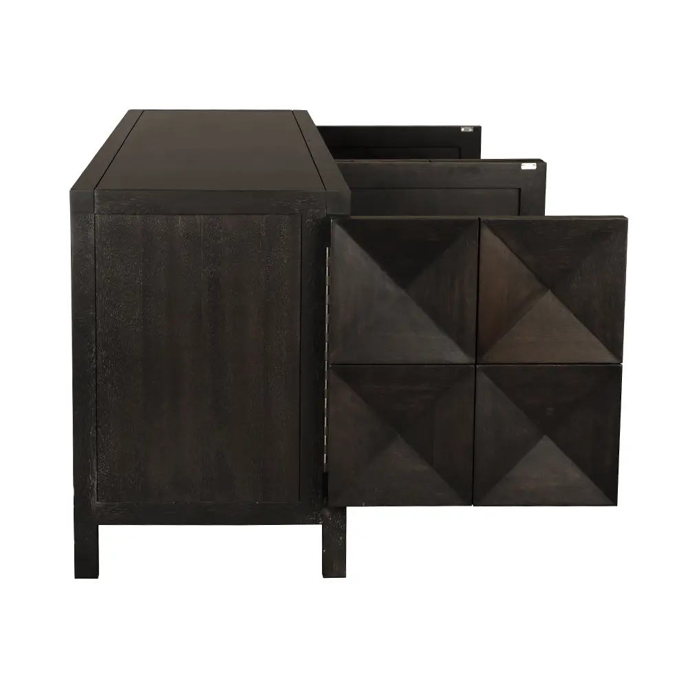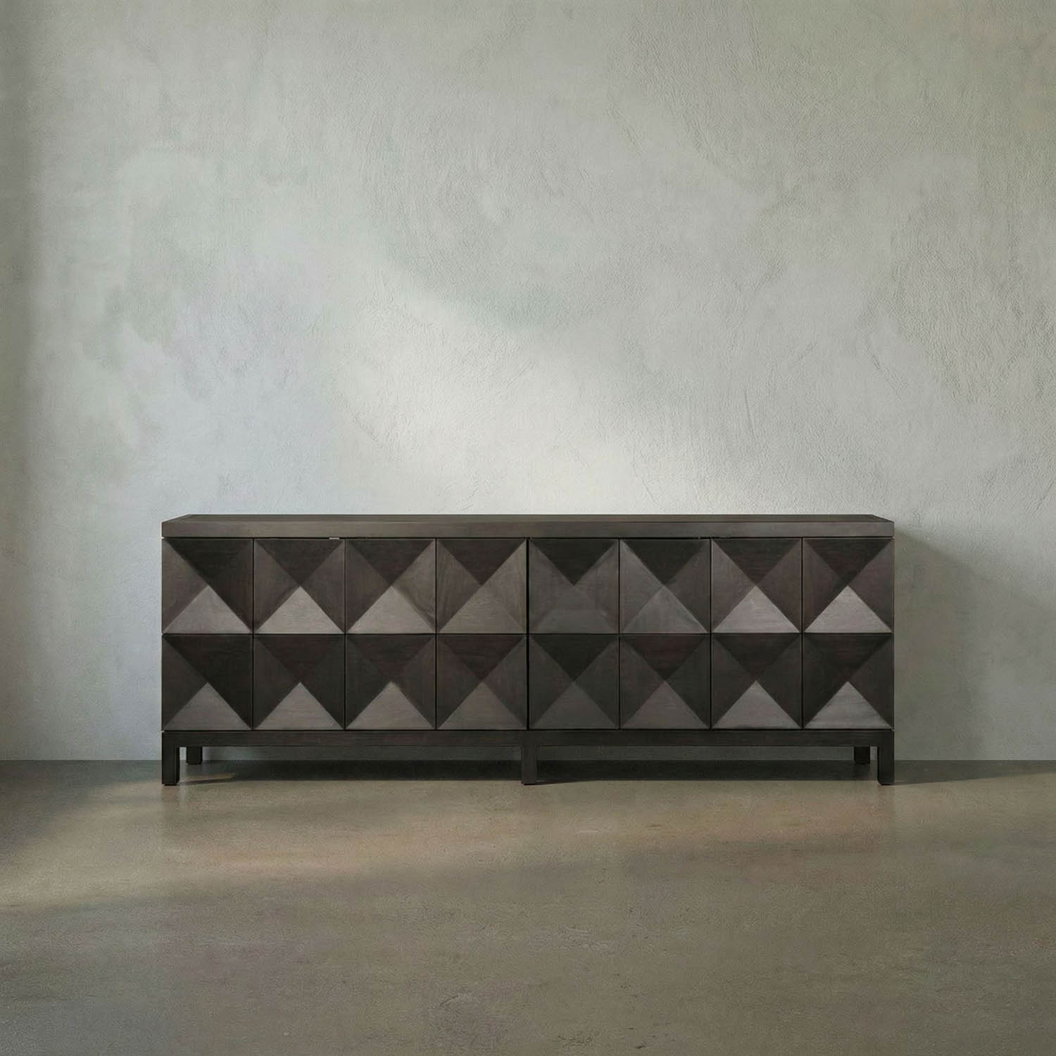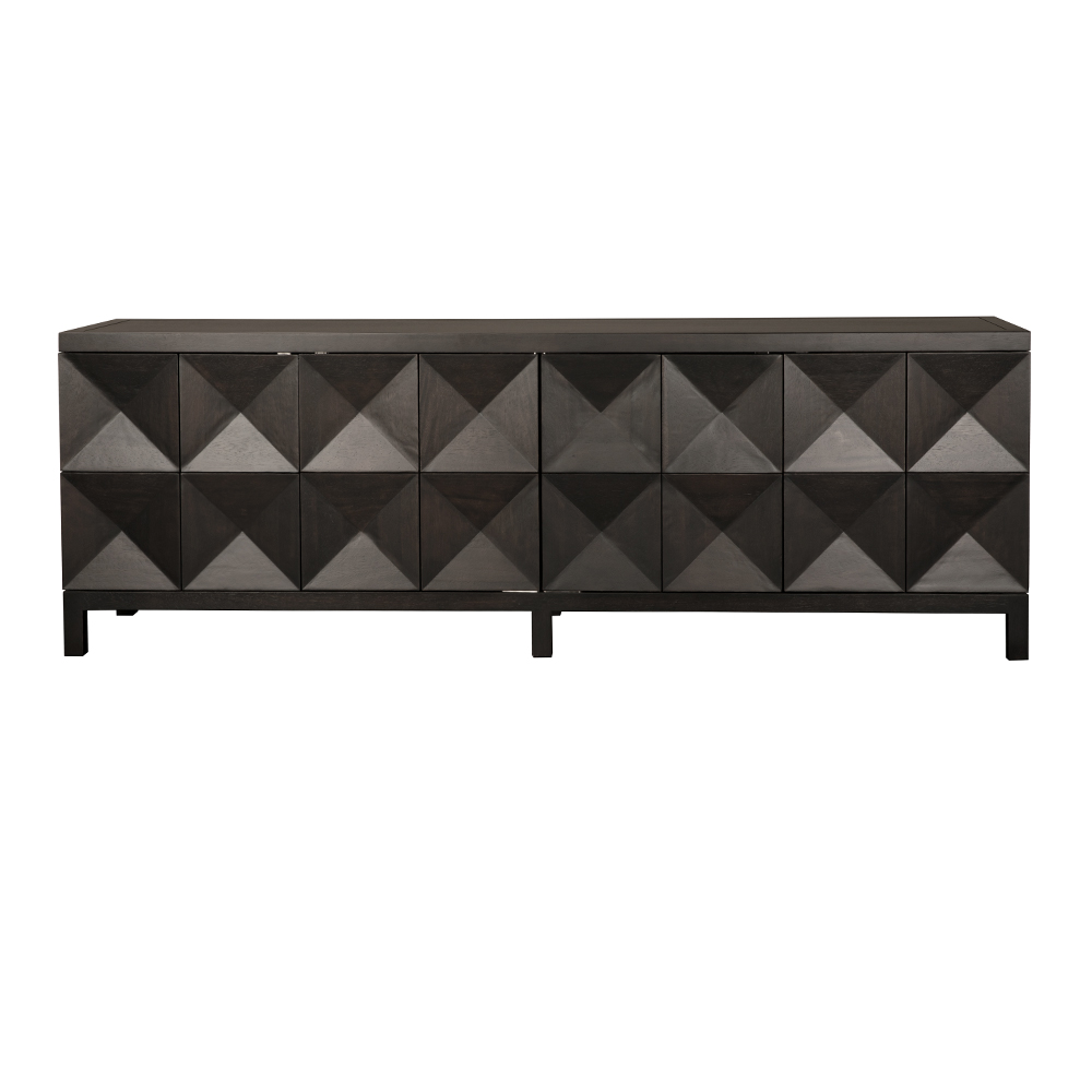This extra-large four-door sideboard features a geometric face in our Ebony Walnut finish. Its elongated profile, clean lines, and raised leg base create a modern, sculptural appearance.