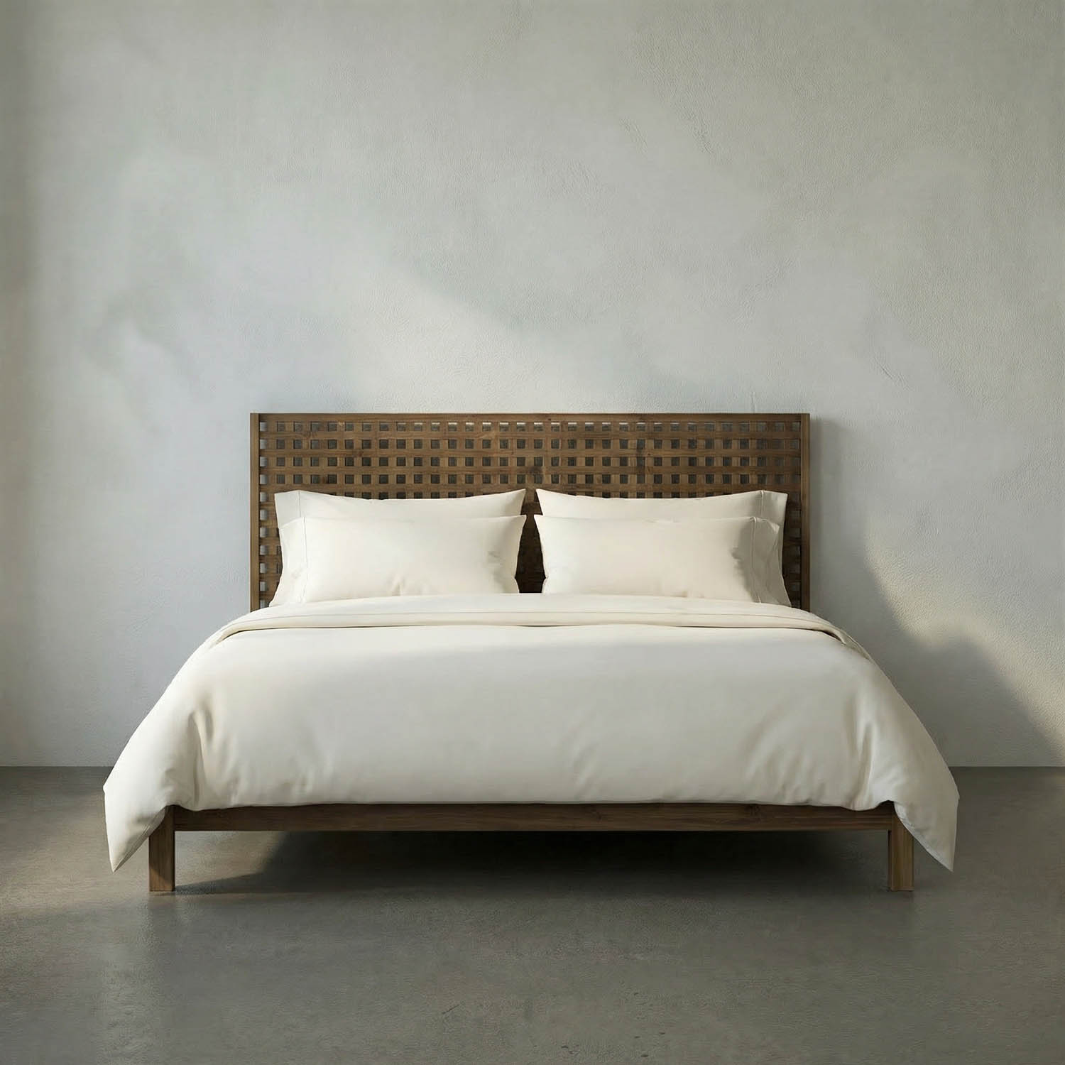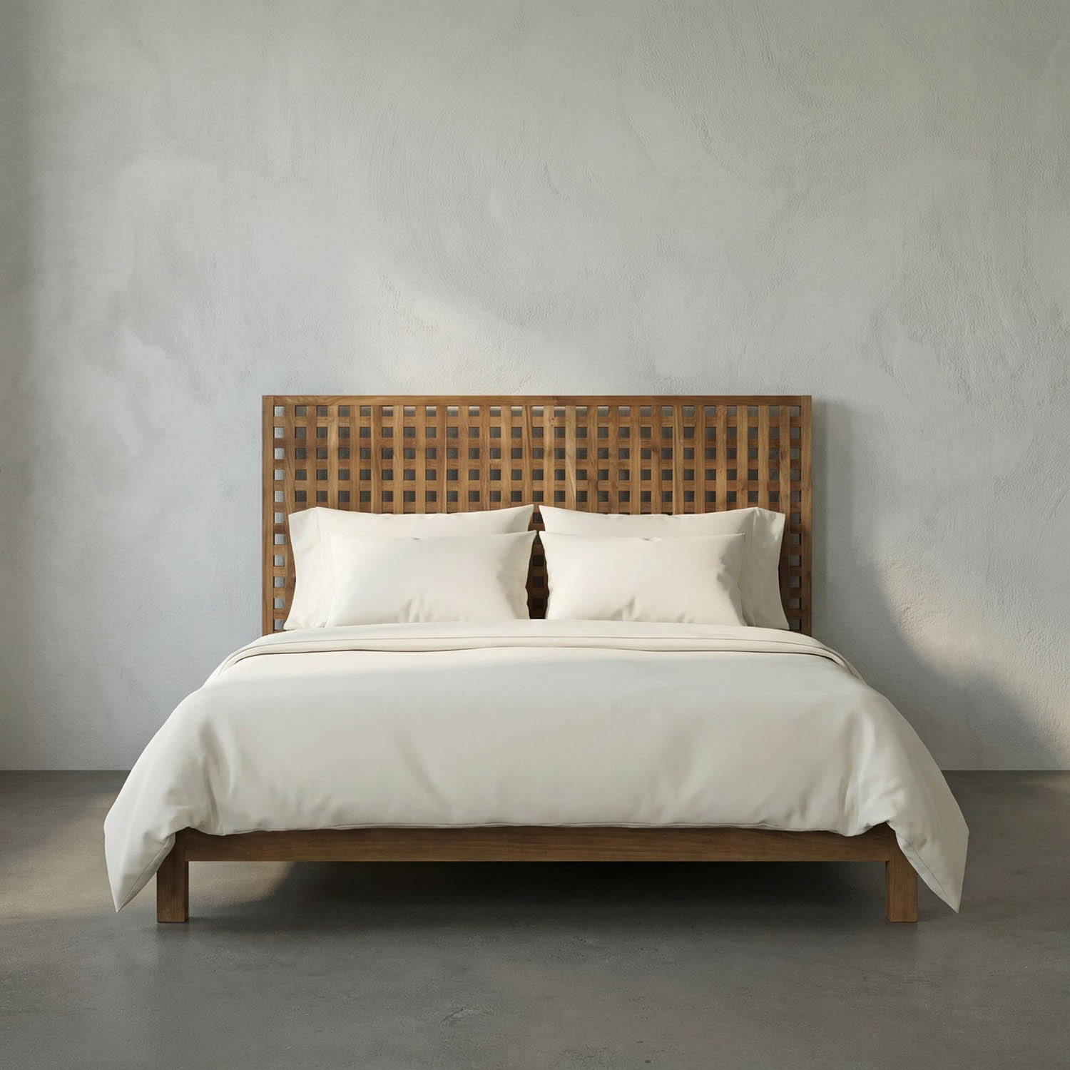 Handcrafted from teak, the Quinnton platform bed features a modern, grid-like headboard and a sleek, low-profile design. Its soft, natural finish enhances the beauty of the tropical wood.