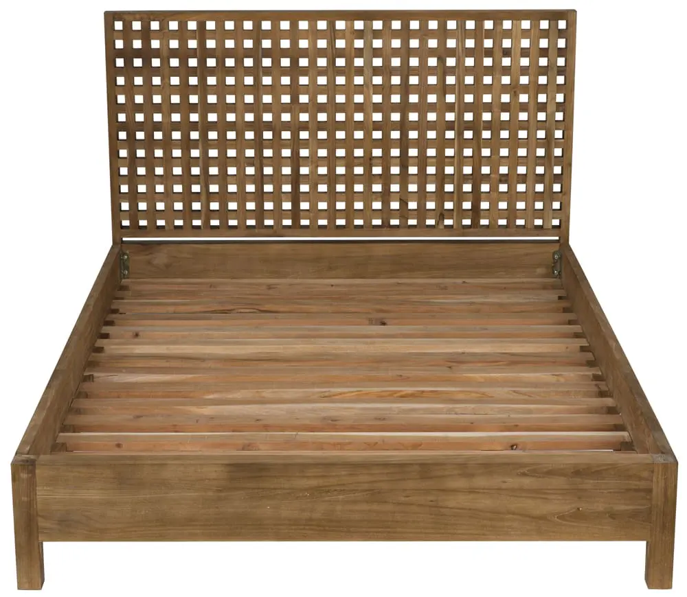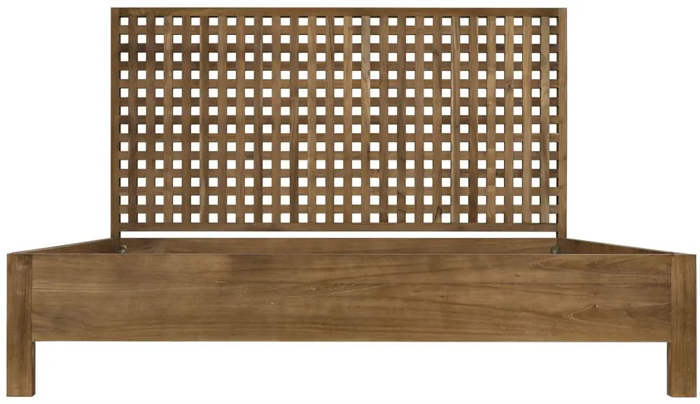 Handcrafted from teak, the Quinnton platform bed features a modern, grid-like headboard and a sleek, low-profile design. Its soft, natural finish enhances the beauty of the tropical wood.