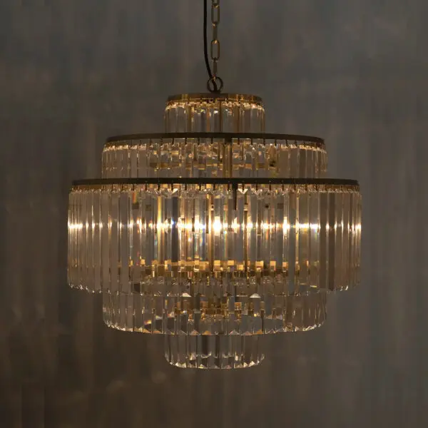 The five-tiered Quintus Chandelier pairs antique brass bands with cascading faceted rectangle glass prisms, creating a tiered silhouette that blends vintage style with modern refinement.